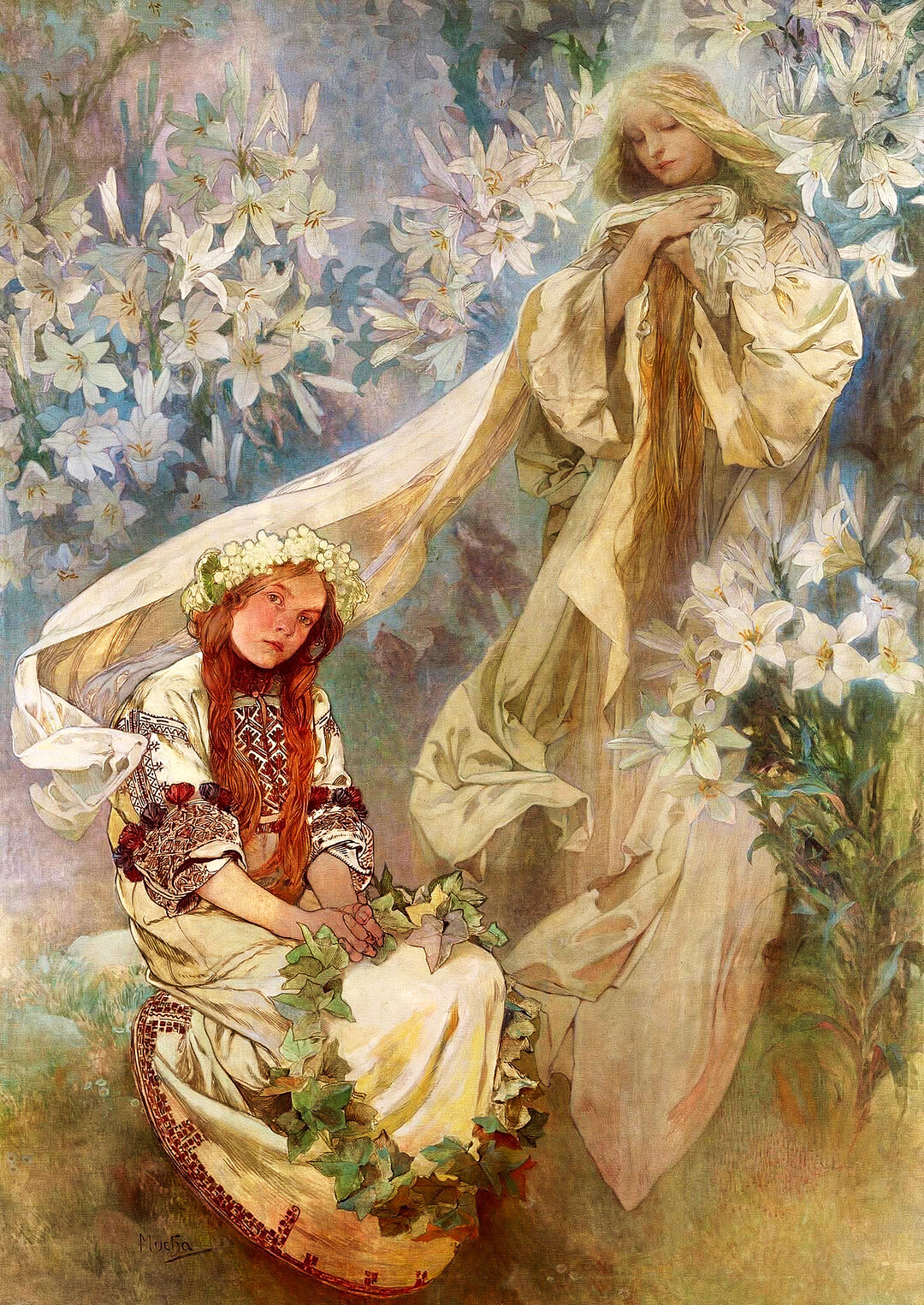 화면은 두 여인으로 구성된다. 전경의 여인은 슬라브 전통 의상을 입고 화관을 쓴 채 앉아있다. 붉은 머리카락과 정교한 자수 장식의 흰 드레스는 체코 민속 문화를 상징한다. 후경의 금발 여인은 흰 백합과 함께 서 있으며, 성모 마리아의 이미지를 환기시킨다. 두 인물은 흐르는 듯한 베일로 연결되어 하나의 시적 장면을 이룬다.