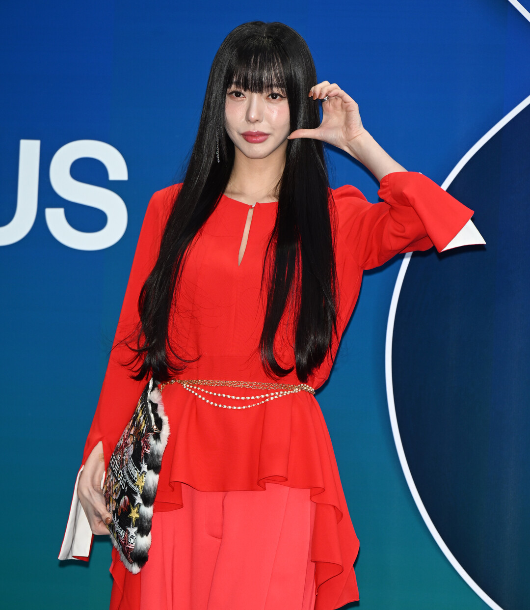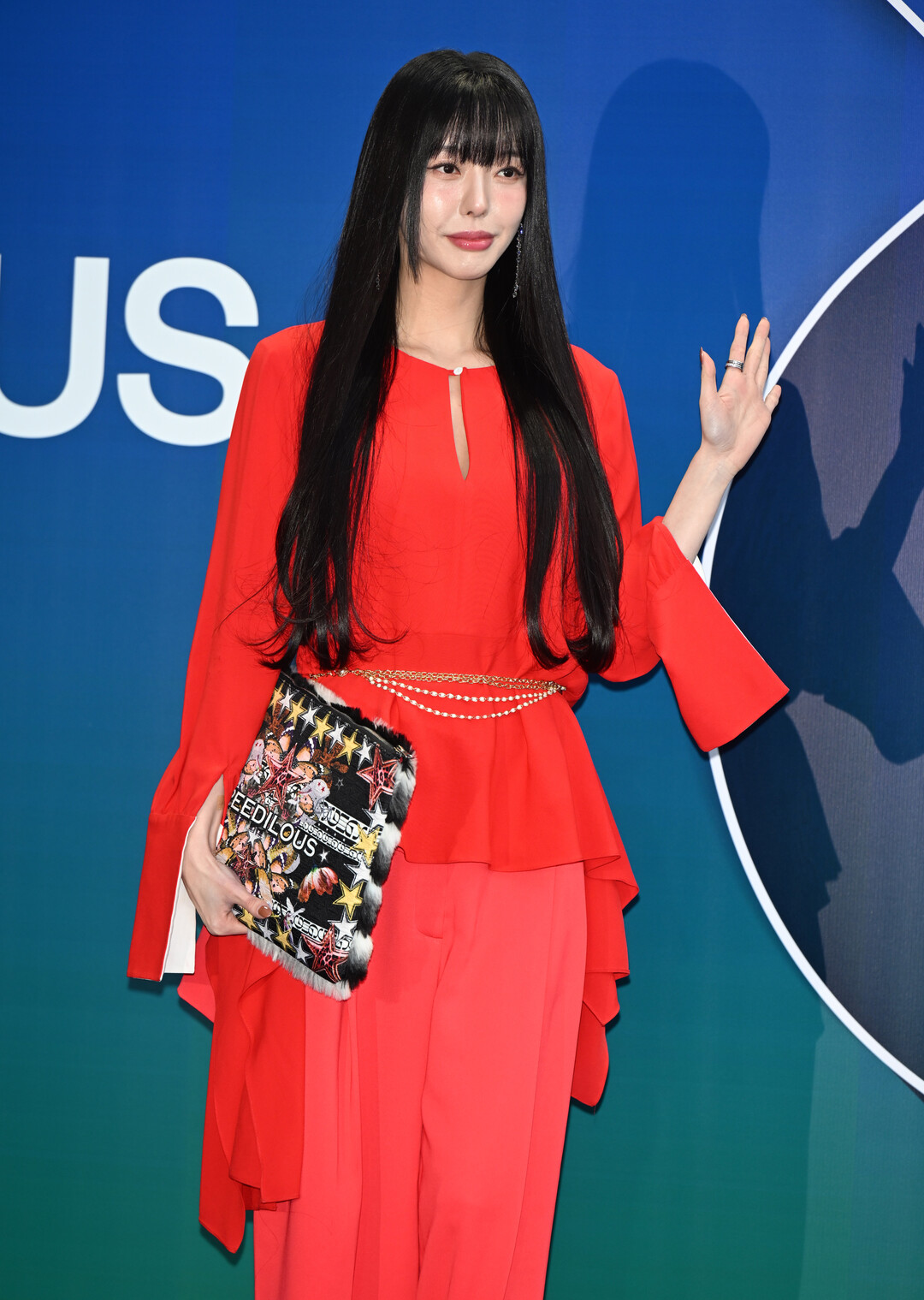 강렬한 레드 의상과 대비를 이루는 블랙&멀티컬러 클러치는 전체 룩에 젊고 에너제틱한 감성을 부여하며, 그리디어스 브랜드의 대담하고 실험적인 디자인 철학을 효과적으로 전달했다.