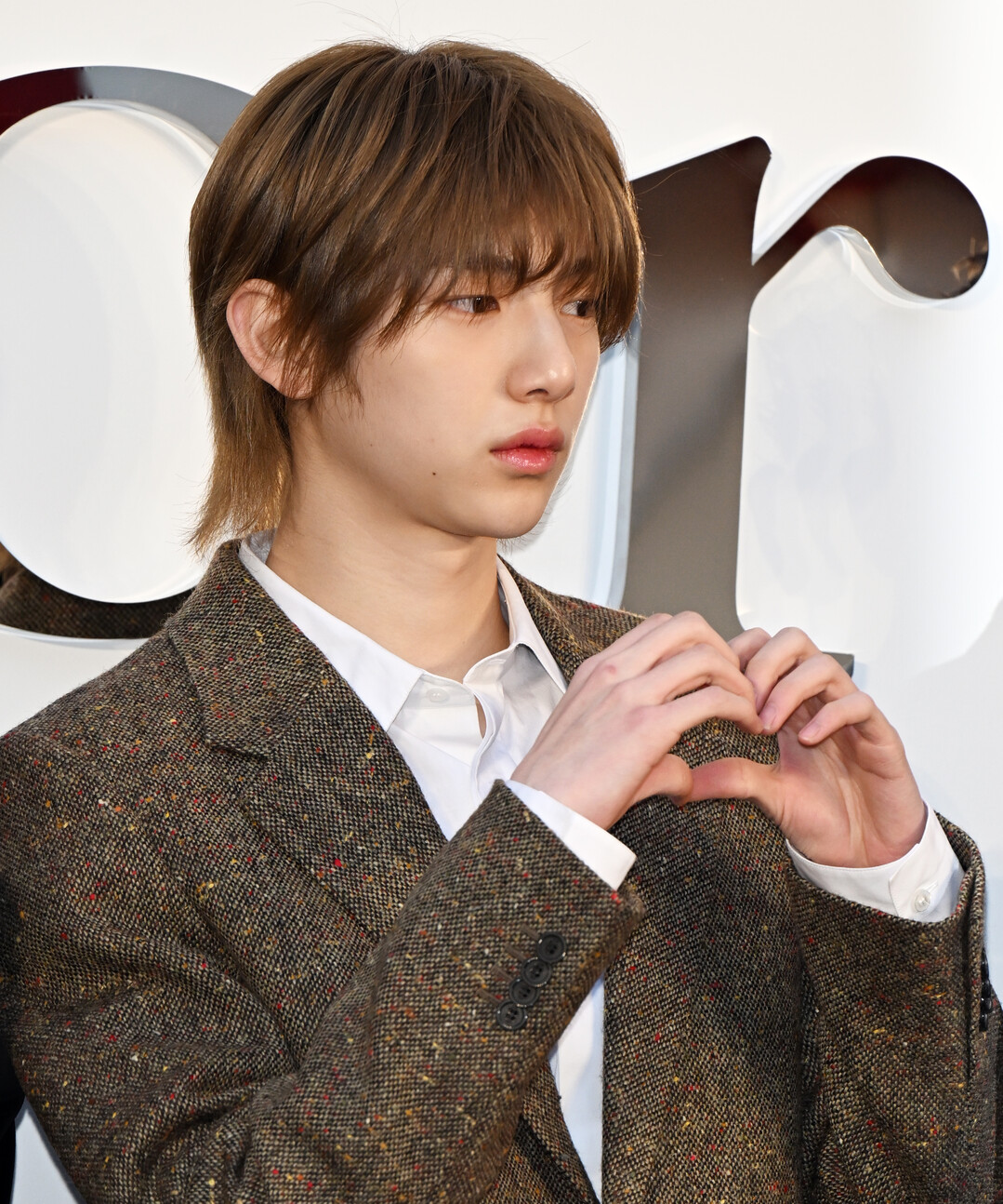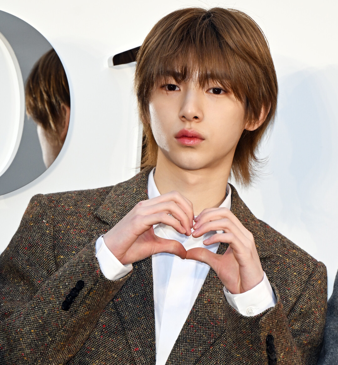 전체적으로 컬러풀한 트위드 재킷과 조화를 이루며 빈티지하면서도 트렌디한 분위기를 완성했다. 무표정일 때는 차분한 인상이지만, 하트를 그리며 미소 짓는 순간 환하게 피어나는 표정은 17세 주훈의 밝은 에너지를 보여준다.
