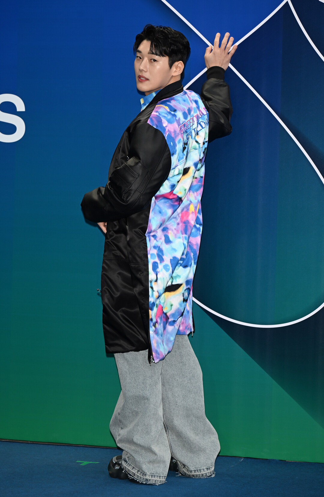권혁수는 포토월에서 재킷을 활용한 다양한 포즈로 역동적인 에너지를 전달했다. 재킷을 양손으로 펼쳐 보이는 포즈는 그리디어스 브랜드의 대담한 디자인을 효과적으로 강조했고, 한쪽 어깨에만 재킷을 걸친 모습은 자유분방한 젊은 감성을 표현했다.