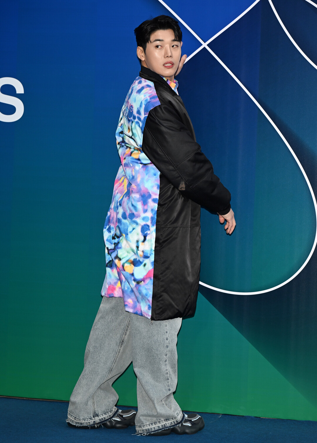 권혁수가 착용한 재킷은 블루, 핑크, 민트, 옐로우가 혼합된 워터컬러 패턴이 돋보이는 오버사이즈 실루엣의 디자인이다. 마치 수채화 물감이 번진 듯한 추상적 패턴은 예술적 감성을 극대화하며 시선을 사로잡았다.