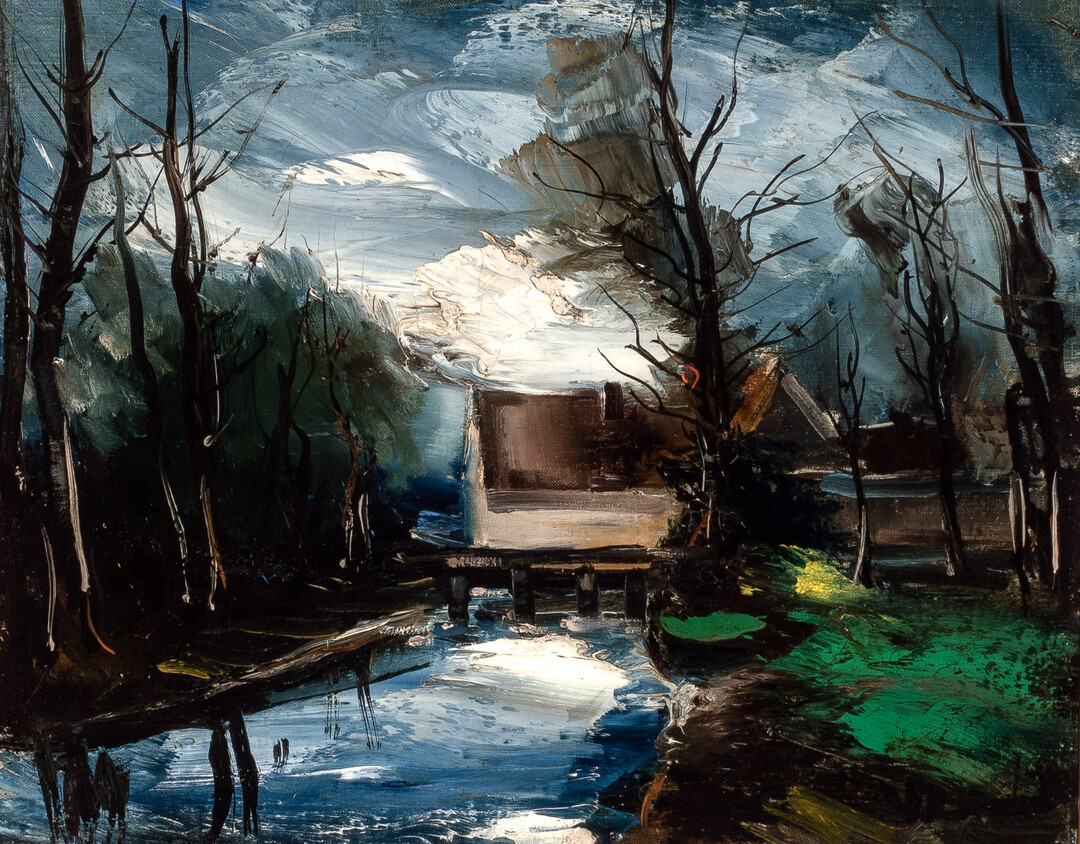 이 작품은 강변의 풍경을 주제로 하고 있으며, 양쪽에 늘어선 나무들 사이로 하늘과 물이 보이는 구도를 취한다. 화면을 지배하는 것은 강렬한 청색과 회색 계열의 하늘과 물, 그리고 이와 대비되는 진한 갈색의 집과 검은색의 나무 실루엣이다. 오른쪽 전경의 밝은 녹색과 황색 패치는 들판을 암시하며 색채적 균형을 이룬다.