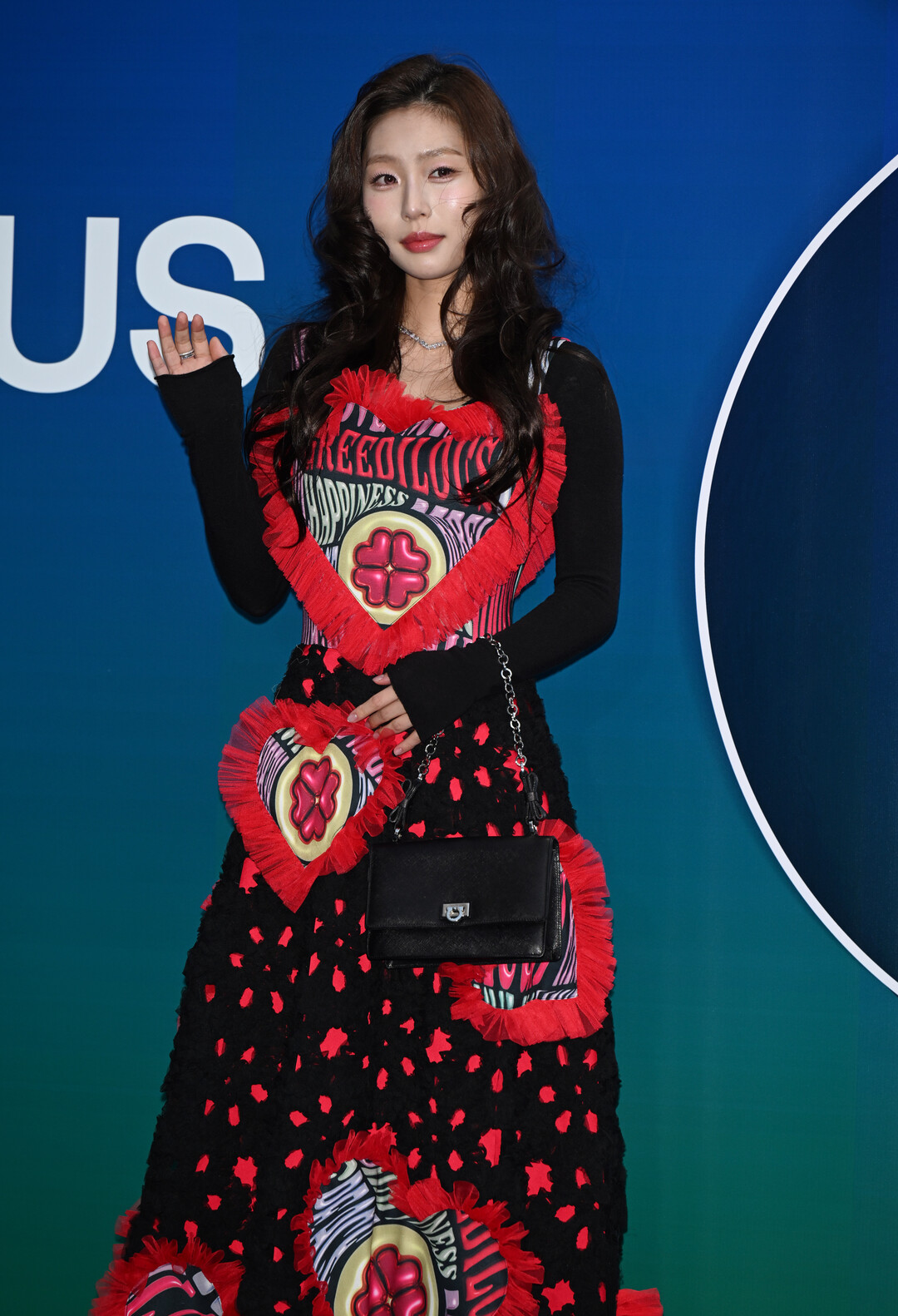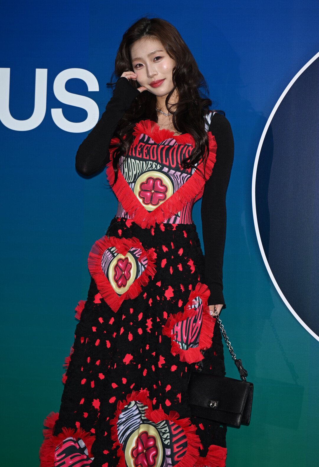 에이미가 착용한 드레스는 그리디어스의 시그니처 디자인 철학을 가장 극적으로 표현한 작품이다. 블랙 베이스에 레드 프린지로 장식된 대형 그래픽 패치가 드레스 전체에 배치되어 마치 입체적인 아트피스를 연상케 한다.