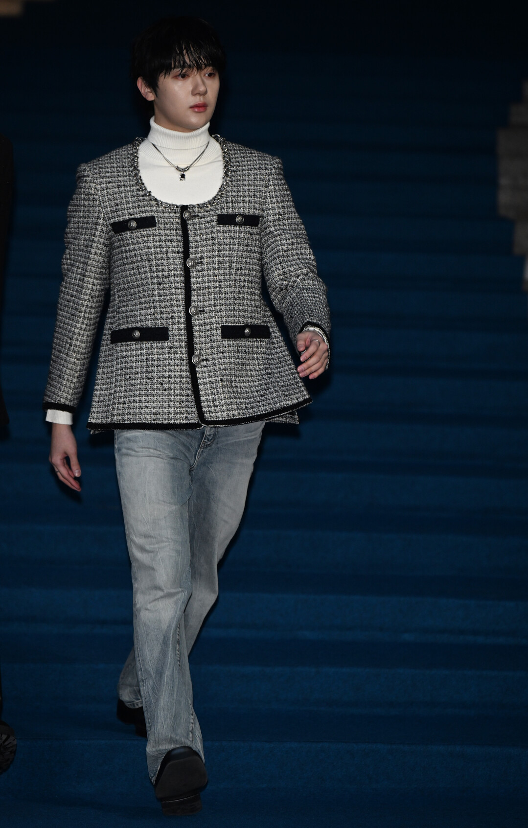 예찬이 선택한 라이트 블루 데님 팬츠는 고급스러운 트위드 재킷과 대비를 이루며 하이로우 믹스 스타일을 구현했다. 정장 재킷에 캐주얼 데님을 매치한 스타일링은 과도한 격식을 덜어내고 편안하면서도 세련된 일상복의 가능성을 보여준다. 이는 패션위크 행사임에도 불구하고 젊은 세대의 자유로운 감각을 표현하려는 의도로 해석된다.