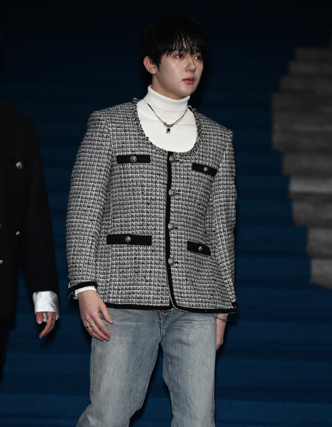[K라이프저니|글·사진 이주상 기자] 2월 3일 동대문디자인플라자에서 열린 2026 F/W 서울패션위크 '뮌(MUNN)' 컬렉션 오프닝에 참석한 오메가엑스 예찬이 세련된 트위드 룩으로 시선을 사로잡았다. 예찬은 그레이 톤 하운드투스 트위드 재킷에 화이트 터틀넥, 라이트 블루 데님 팬츠를 매치한 모던 클래식 스타일을 선보였다. 블랙 벨벳 디테일이 포인트로 들어간 트위드 재킷은 샤넬의 시그니처 디자인을 연상시키면서도, 젊고 캐주얼한 느낌으로 재해석돼 20대 아이돌의 감성을 담아냈다.