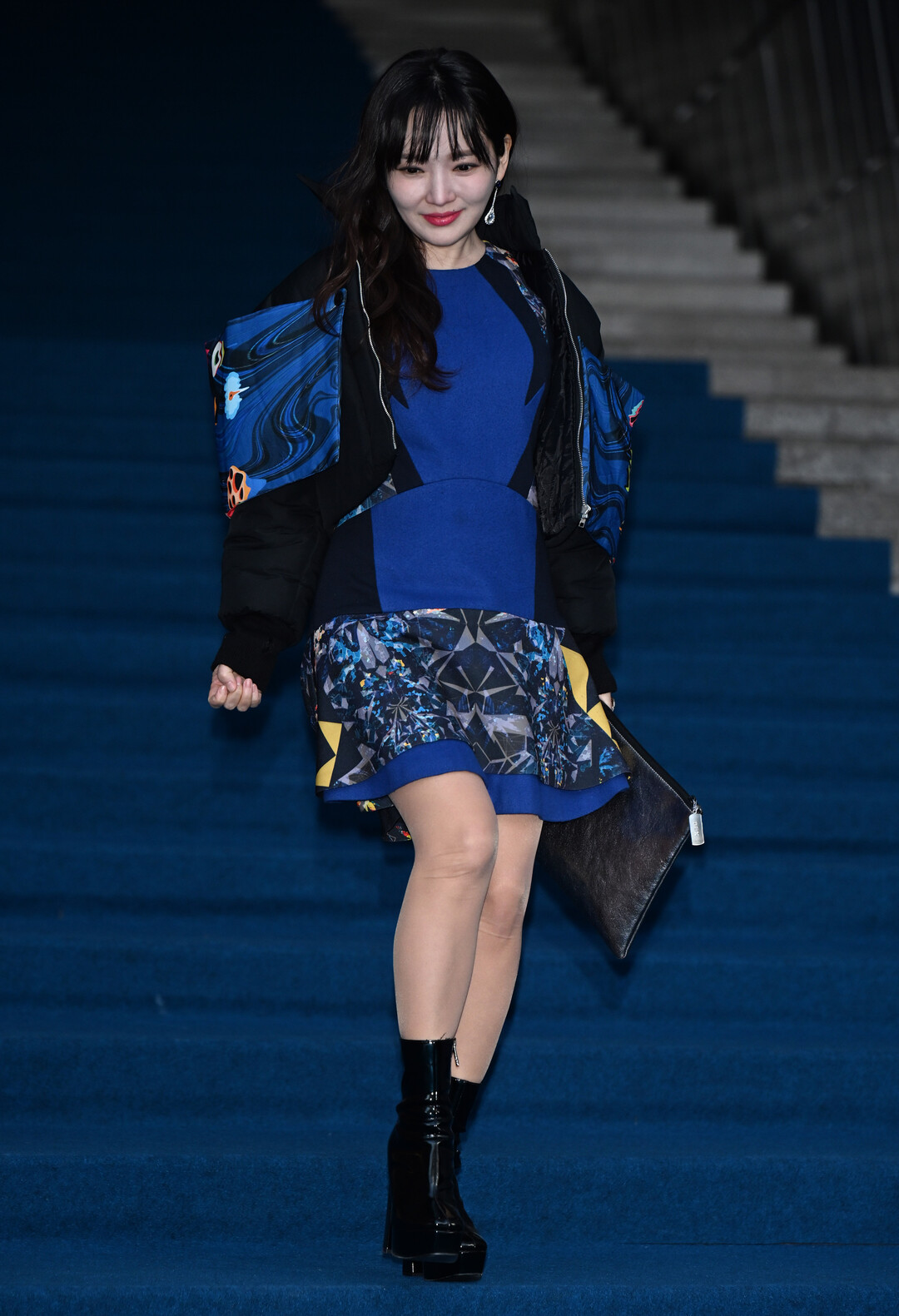 윤송아의 룩을 완성한 것은 그리디어스의 시그니처 오버사이즈 재킷이다. 블랙 베이스에 로열 블루의 마블링 패턴이 소매 전체를 뒤덮은 이 재킷은 마치 추상화를 연상케 하는 강렬한 비주얼을 자랑한다.