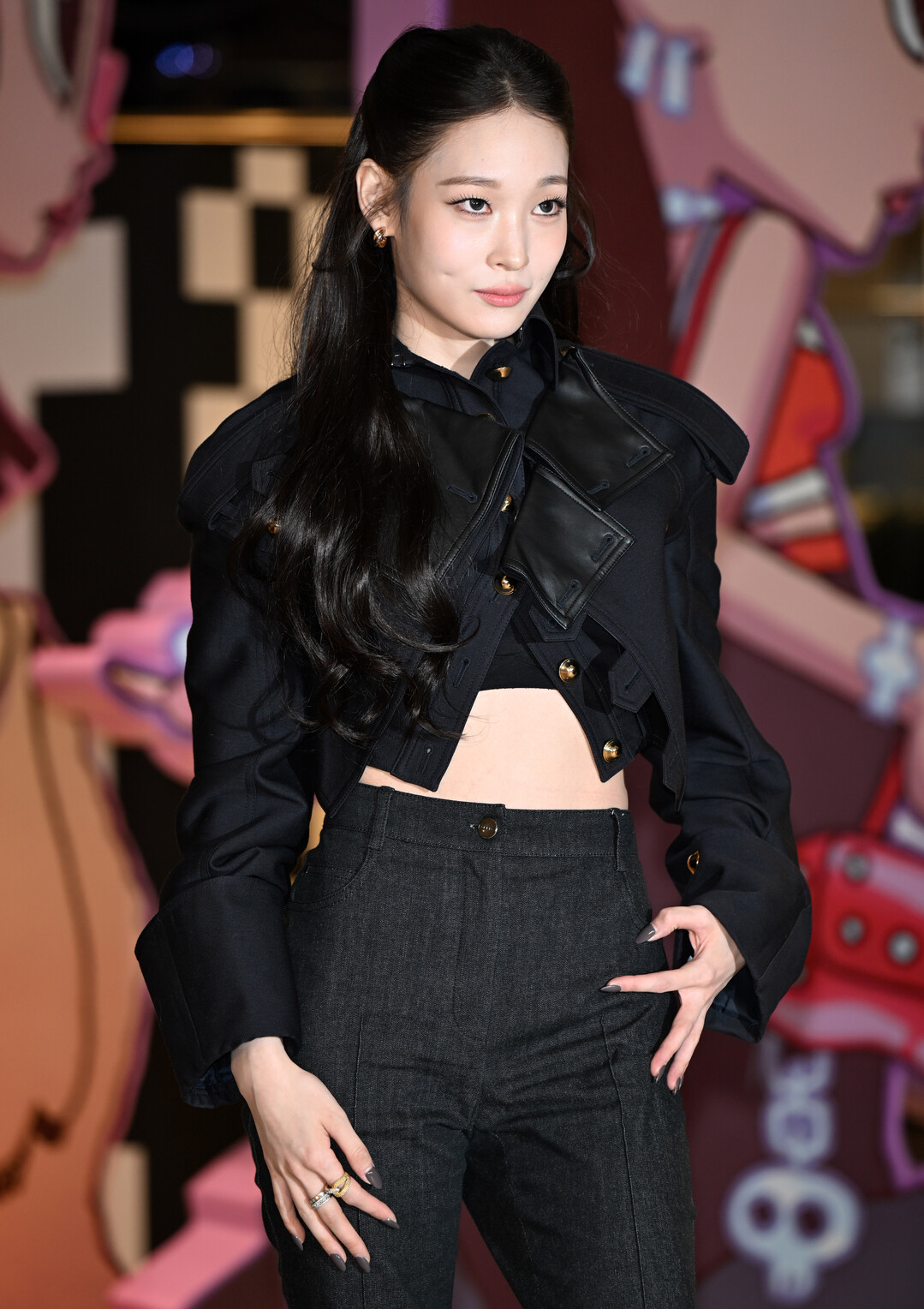 하의는 다크 그레이 톤의 하이웨이스트 데님 팬츠를 선택했다. 슬림한 실루엣의 스트레이트 핏은 다리 라인을 깔끔하게 정리했으며, 하이웨이스트 디자인으로 크롭 재킷과의 완벽한 조화를 이뤘다. 발목까지 이어지는 긴 기장은 전체적인 비율을 더욱 돋보이게 하는 효과를 냈다.