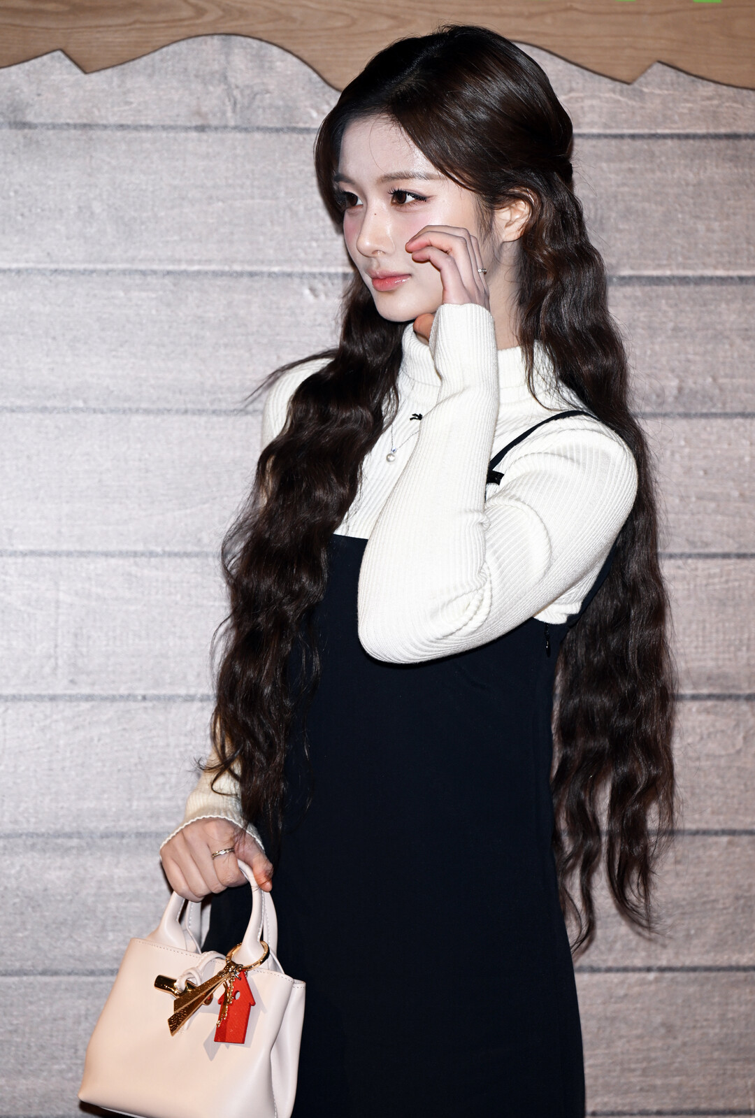 이날 설윤은 블랙과 화이트의 모노톤 배색으로 깔끔하면서도 세련된 스타일을 완성했다. 화이트 립 니트 톱 위에 리본 스트랩이 포인트인 블랙 미니 원피스를 레이어드해 입체적인 룩을 연출했다. 특히 어깨에서 묶이는 리본 디테일은 소녀스러운 감성을 더했다.
