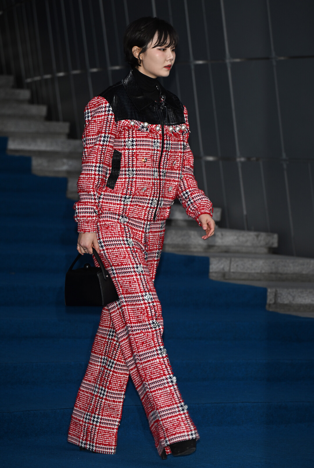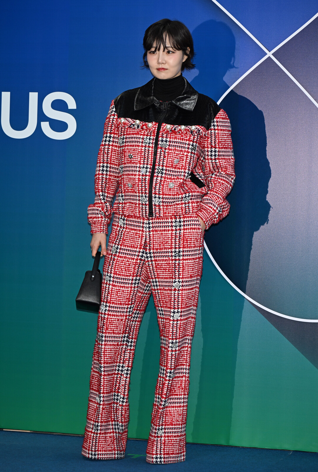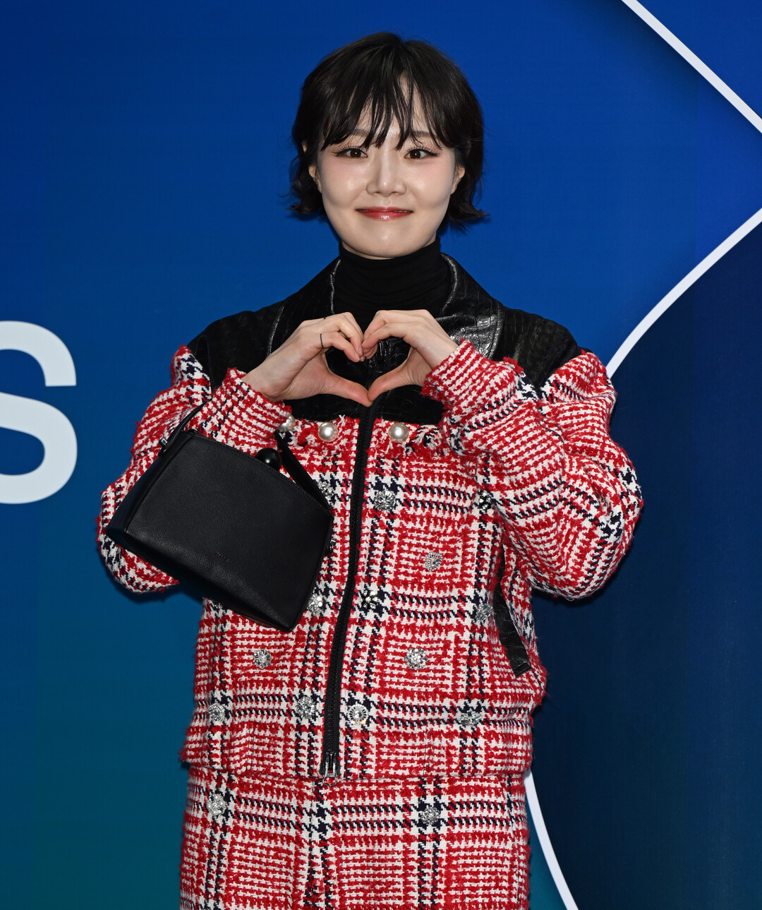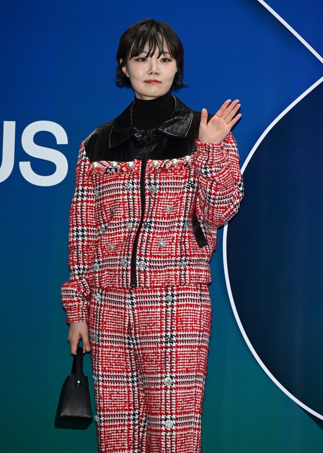 손수아가 착용한 수트는 레드, 화이트, 블랙 컬러가 조화를 이룬 하운드투스 체크 패턴이 돋보이는 디자인이다. 전통적인 트위드 질감을 현대적으로 재해석한 이 패브릭은 클래식한 우아함과 모던한 감각을 동시에 표현했다.