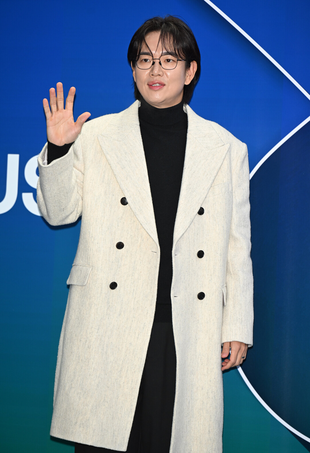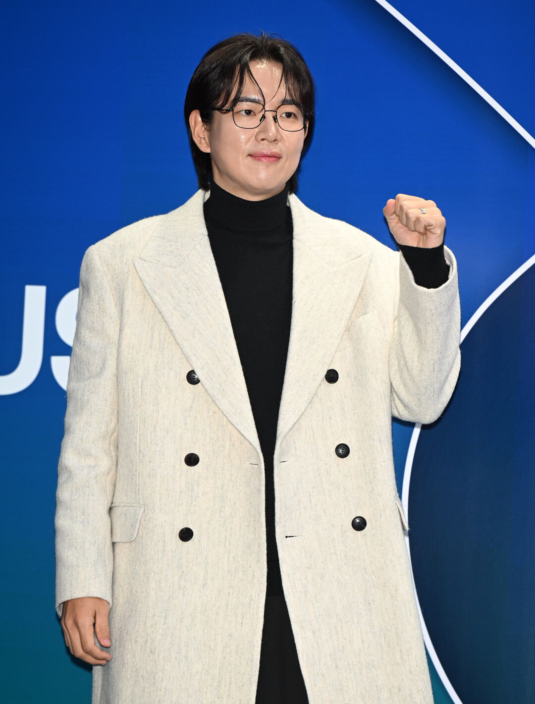 코트의 와이드 라펠과 6개의 블랙 버튼은 전통적인 테일러링 기법을 충실히 따르면서도 현대적인 감각을 더했다. 허벅지 중간까지 내려오는 미디 길이는 장성규의 체형을 돋보이게 하며 세련된 실루엣을 완성했다.