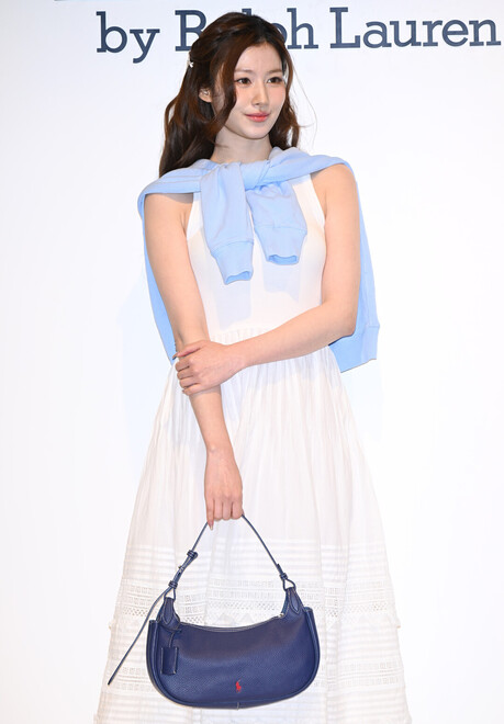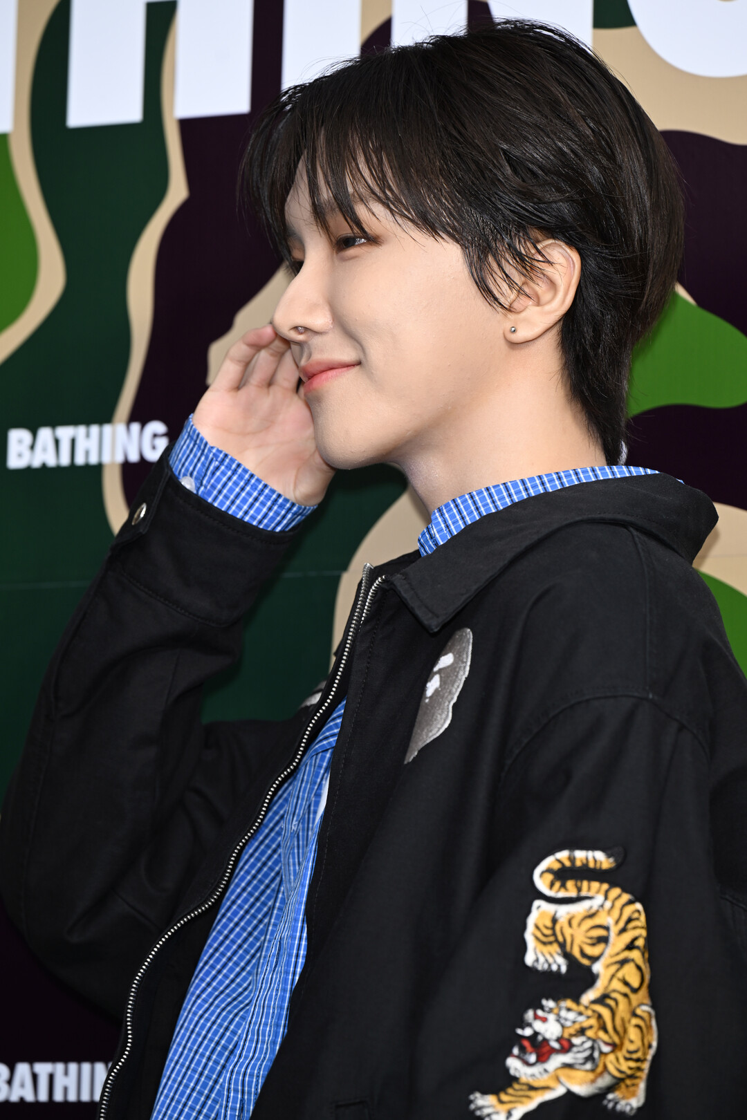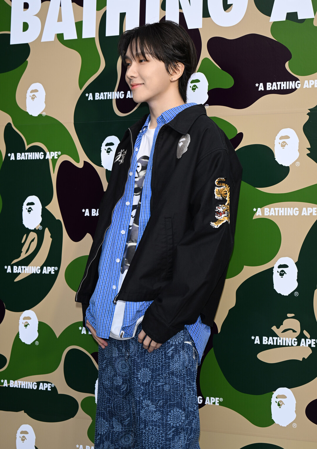 재킷 안으로는 블루 체크 패턴의 오버사이즈 셔츠와 BAPE 그래픽 프린트 화이트 티셔츠를 겹쳐 입어 전형적인 스트리트 스타일의 레이어드 룩을 완성했다. 하의로는 블루 계열 플로럴 패턴의 와이드 팬츠를 매치해 상의의 블루 체크 셔츠와 색감을 자연스럽게 연결시키는 센스를 발휘했다. 전체적으로 블랙과 블루의 조화 속에 BAPE 특유의 스트리트 감성을 젊고 세련되게 풀어낸 코디네이션이라는 평가다.