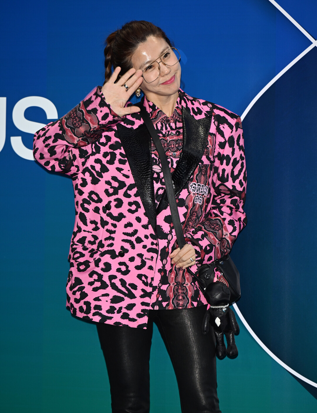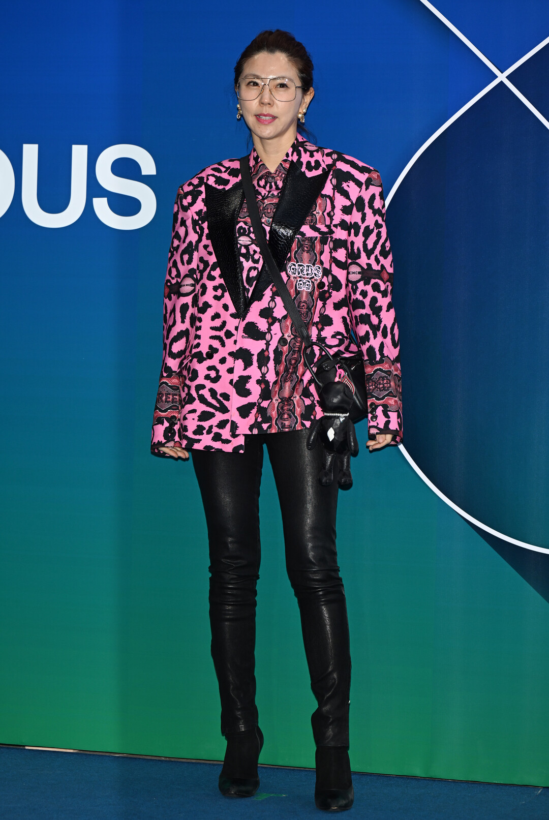 골드 프레임의 오버사이즈 안경은 이윤미의 시그니처 아이템이다. 빈티지한 느낌의 안경은 파워풀한 레오파드 재킷과 절묘한 균형을 이루며 지적이면서도 시크한 분위기를 연출했다. 골드 이어링은 과하지 않은 포인트로 전체적인 룩의 완성도를 높였다.