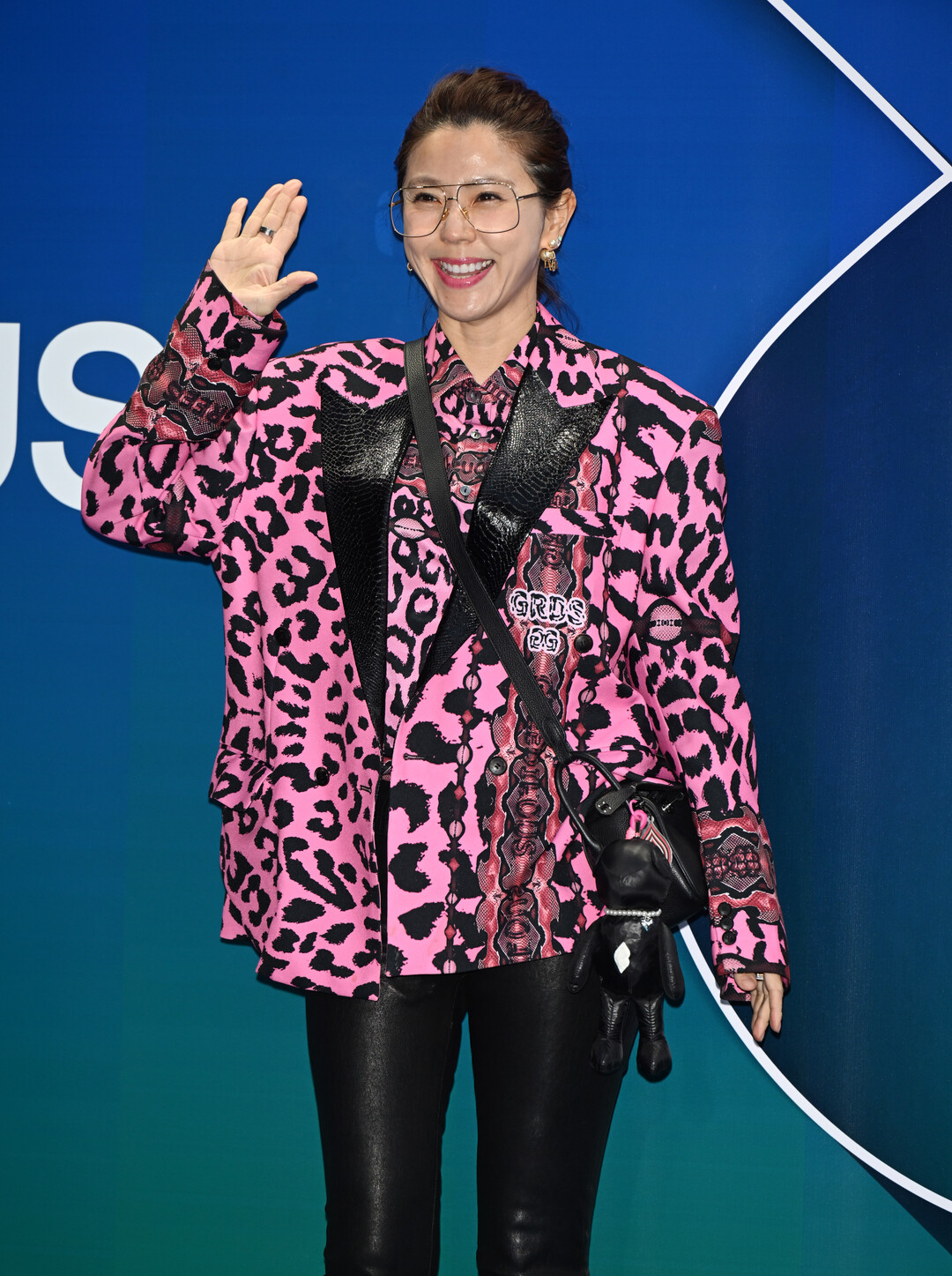 이윤미가 착용한 재킷은 핫 핑크 베이스에 블랙 레오파드 패턴이 전체적으로 배치된 대담한 디자인이다. 전통적인 애니멀 프린트를 네온 핑크 컬러로 재해석한 이 재킷은 그리디어스 특유의 실험적 감성을 극대화했다.