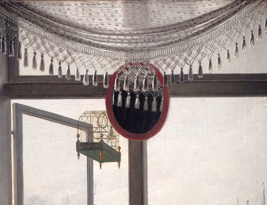 열린 창문 너머로는 코펜하겐 항구의 풍경이 펼쳐진다. 흐릿한 대기 원근법 속에 정박한 범선들의 마스트가 하늘을 찌르고, 부두와 해안선이 부드러운 안개 속에 잠겨 있다. 화법은 에케르스베르크 계열의 정밀한 사실주의를 기반으로 하되, 실내의 세부 묘사는 극도로 치밀하고 실외의 항구 풍경은 대기의 빛 속에 부드럽게 녹아들어 두 공간의 질감이 자연스럽게 대비를 이룬다.