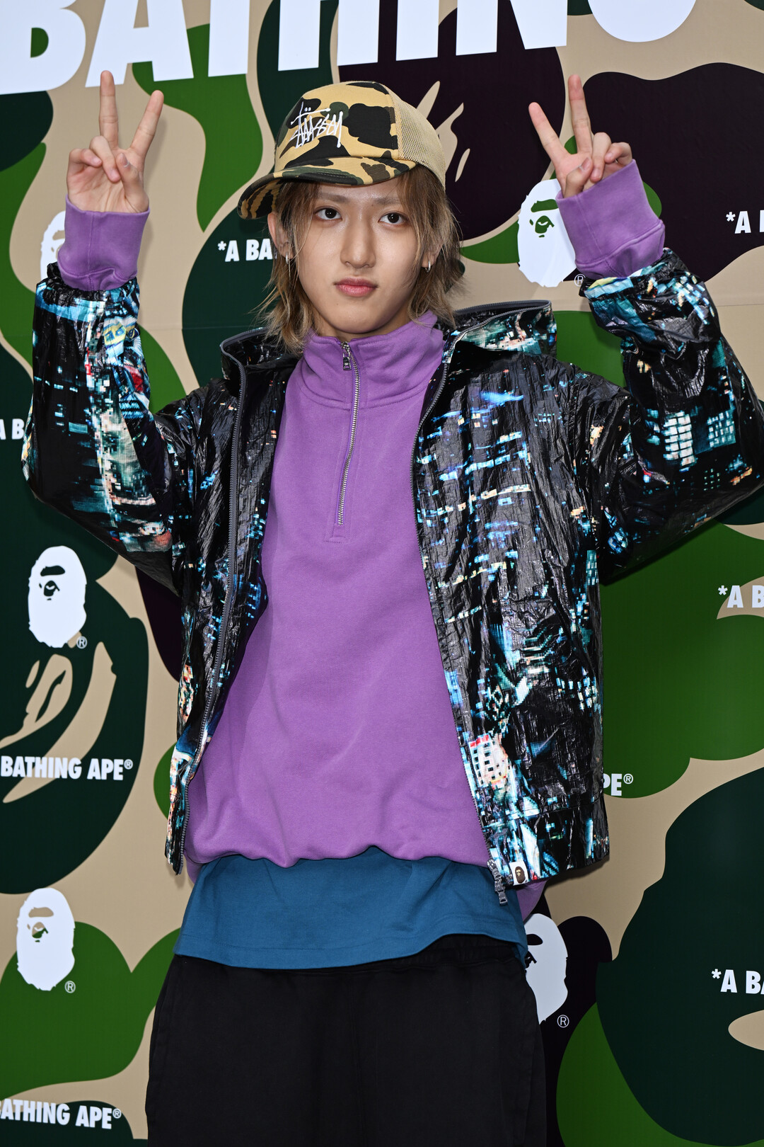 이너로는 선명한 퍼플 컬러의 하프집업 스웨트셔츠를 매치해 다크한 재킷과 강렬한 색감 대비를 연출했고, 그 아래 테일 부분이 살짝 드러나는 블루 이너를 레이어드해 컬러 믹스에 한층 풍부한 깊이를 더했다. 하의는 블랙 트랙 팬츠로 마무리해 상의의 화려한 컬러가 충분히 돋보일 수 있도록 균형을 맞췄다. 퍼플 소매 끝에는 BAPE 원숭이 헤드 로고 패치가 새겨져 있어 디테일에 대한 세심한 주의를 보여줬다.