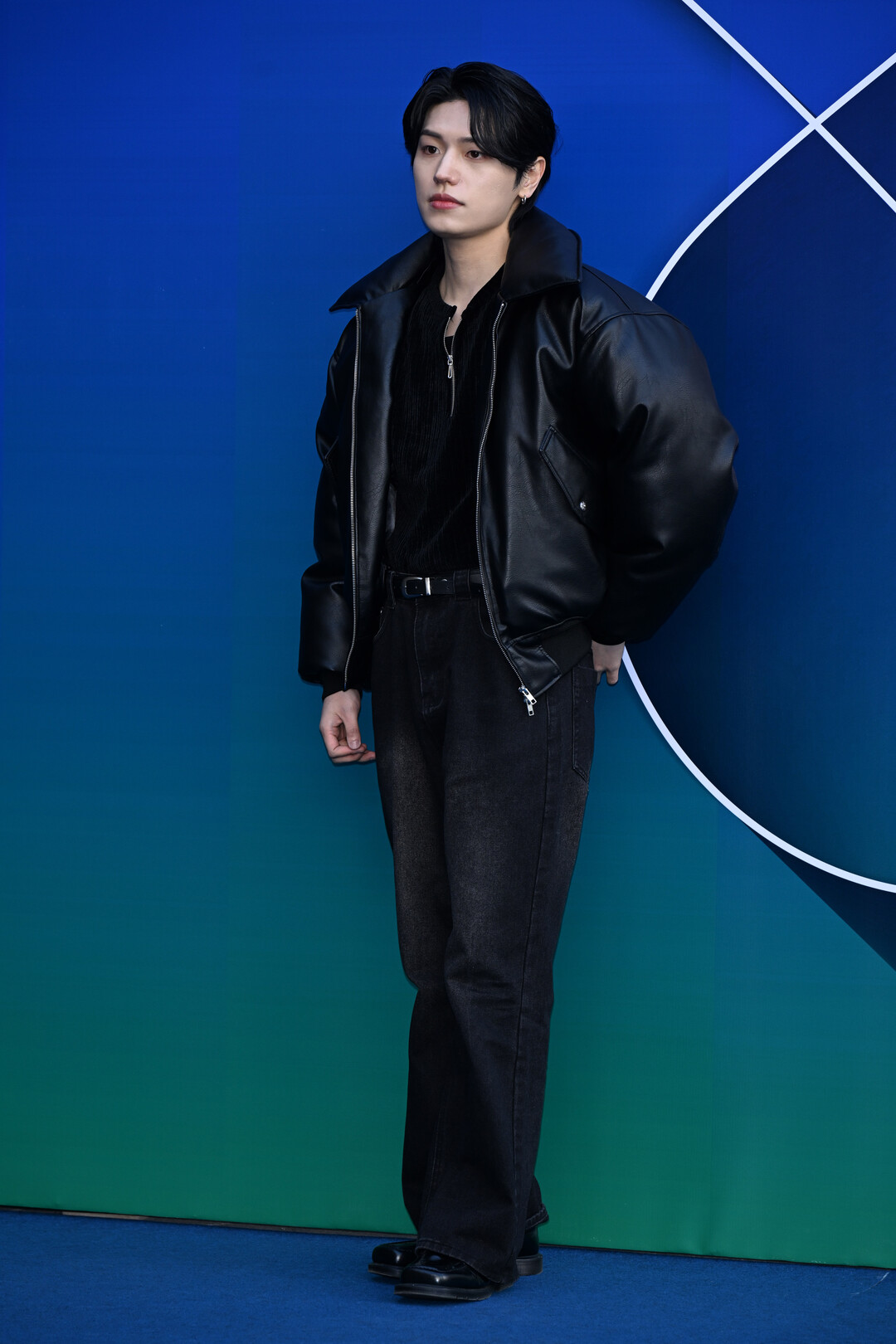한즈가 선택한 스타일링의 핵심은 오버사이즈 블랙 레더 봄버 재킷이었다. 부드러운 램스킨 소재는 고급스러운 질감을 드러냈고, 볼륨감 있는 칼라와 어깨 라인은 당당한 실루엣을 완성했다.