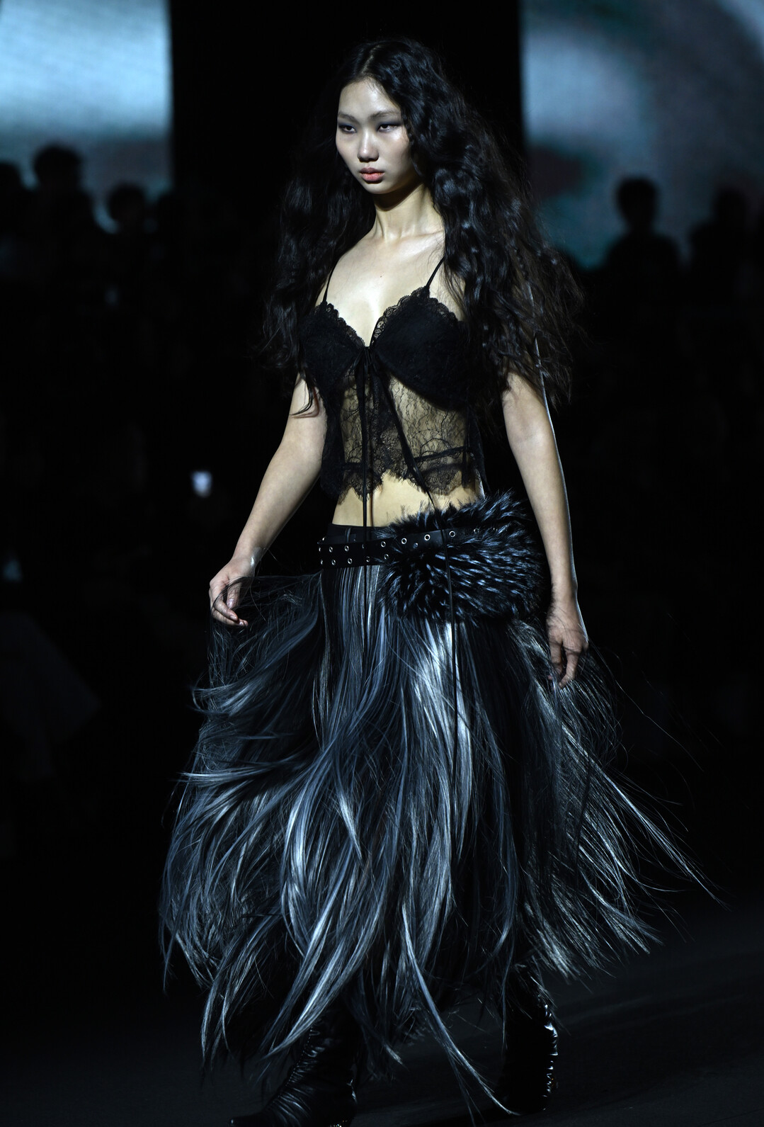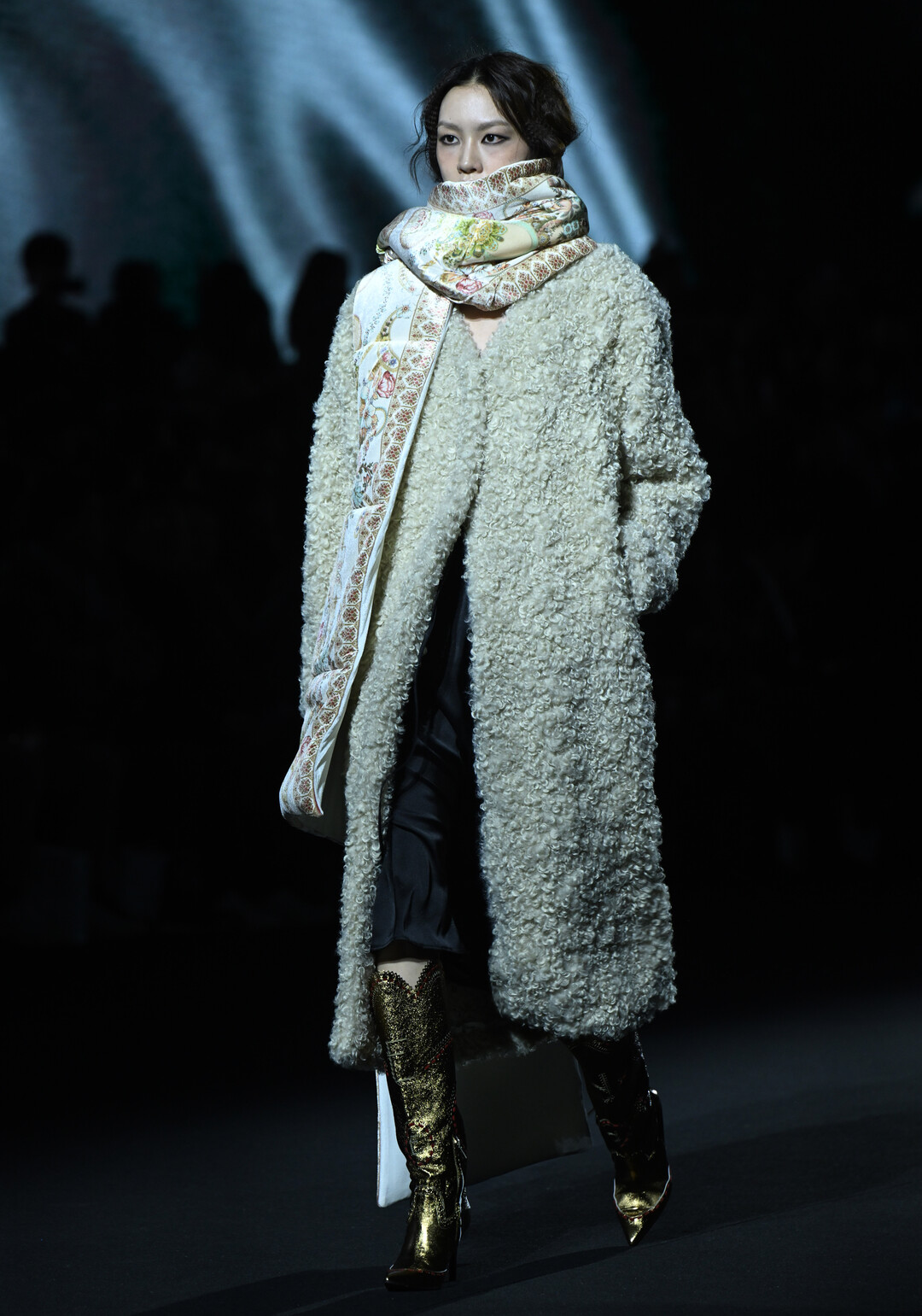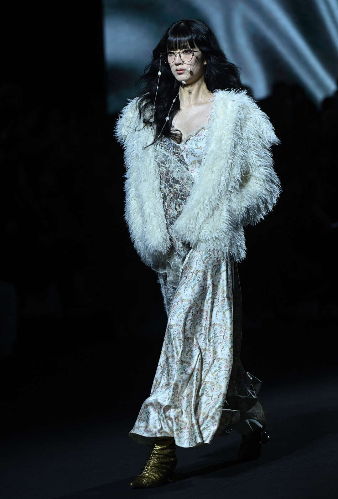 런웨이를 장식한 룩들은 미세한 선이 흐르는 절제된 구조의 테일러링과 바디를 따라 흐르는 라인, 서로 다른 질감의 패브릭을 쌓아 올린 레이어링을 통해 정적이면서도 부드러운 에너지를 표현했다. 특히 오프화이트 컬러의 부클레 코트와 화려한 페이즐리 패턴 스카프의 조합, 블랙 레이스 코르셋 위에 덧입은 크러시드 벨벳 원피스, 그리고 퍼 재킷과 골드 메탈릭 부츠의 만남은 대비와 조화라는 두 가지 미학을 동시에 구현했다.
