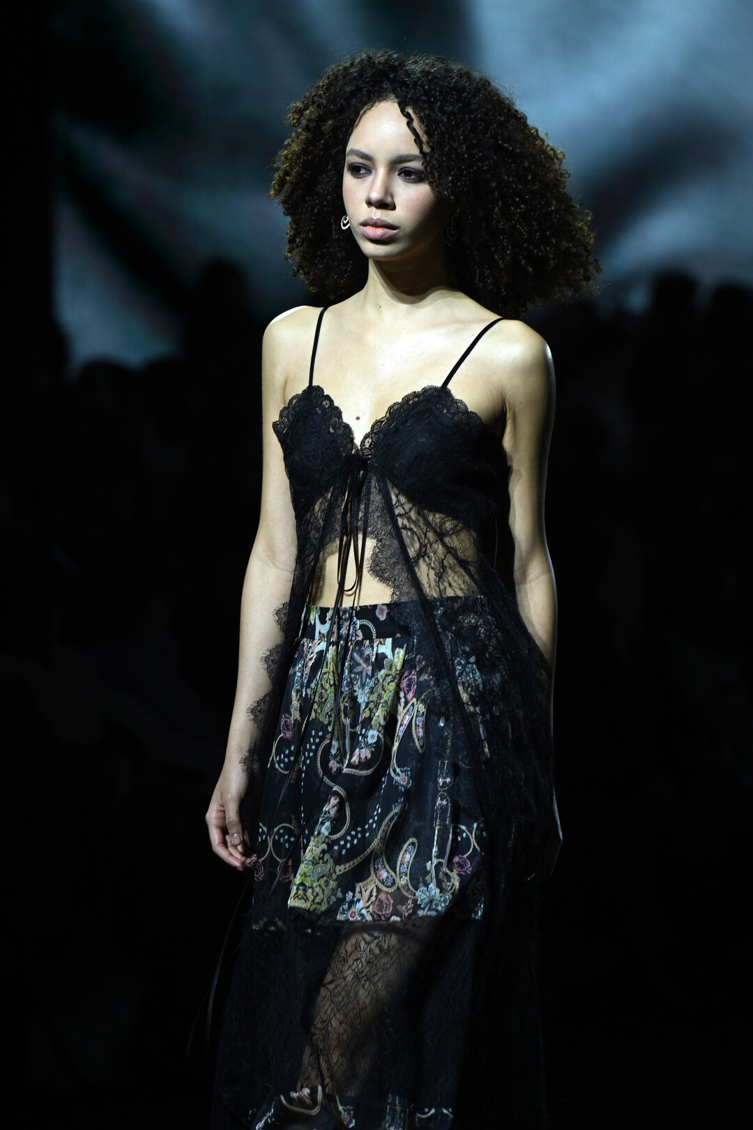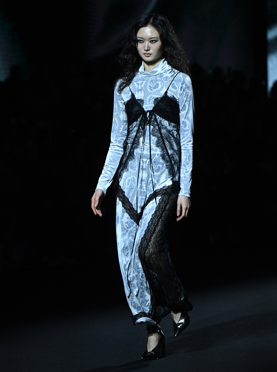 컬렉션 전반에 걸쳐 동양적 페이즐리 모티브와 서양의 빅토리안 레이스, 퍼와 시퀸, 벨벳과 시폰 등 이질적인 소재들이 한 룩 안에서 공존했다. 이는 단순한 믹스매치를 넘어, 서로 다른 질감의 패브릭이 만들어내는 촉각적 긴장감과 시각적 풍요로움을 동시에 추구한 결과다.