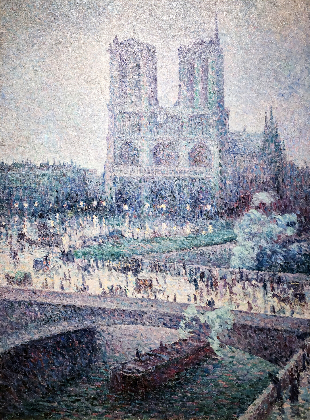 게시한 작품은 프랑스 신인상주의를 대표하는 화가 막시밀리앙 뤼스(Maximilien Luce, 1858-1941)가 센 강변에서 바라본 노트르담 대성당을 그린 작품이다. 작품의 제목도 '노트르담 대성당'이다. 뤼스는 조르주 쇠라와 폴 시냐크가 창시한 점묘법(Pointillism)을 충실히 계승하며, 과학적 색채 이론을 바탕으로 순수한 색점들을 캔버스에 병치하는 독특한 화풍을 구축했다.