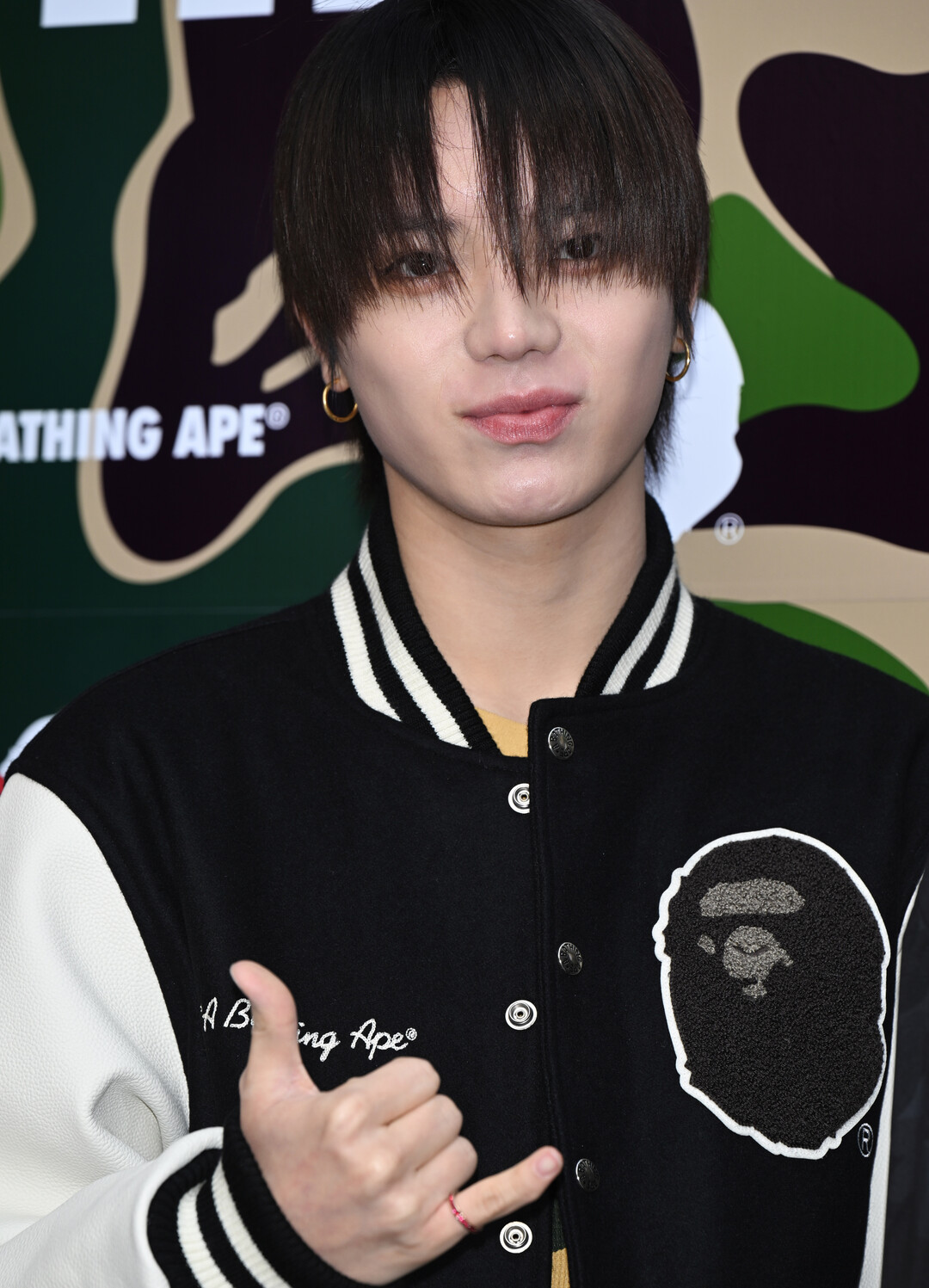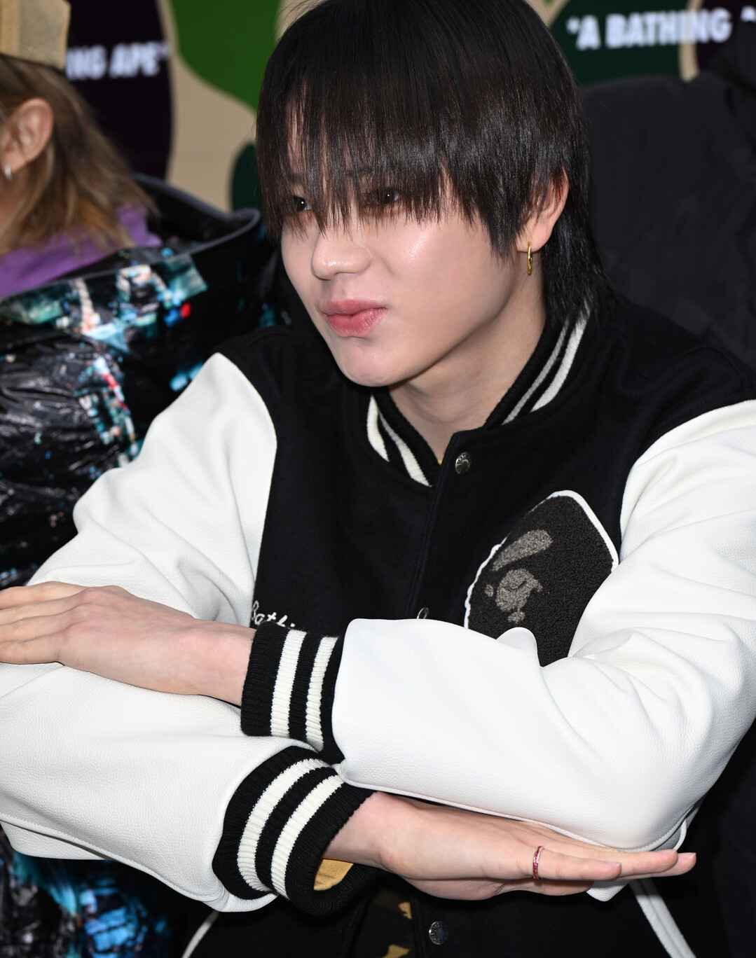 이날 오율의 패션은 BAPE의 헤리티지를 가장 클래식한 방식으로 표현한 코디네이션으로 눈길을 끌었다. 메인 아이템은 블랙 울 바디와 화이트 레더 소매가 대비를 이루는 BAPE 시그니처 바시티 재킷이었다. 재킷 가슴에는 대형 원숭이 헤드 패치가 자수로 정교하게 장식됐으며, 오른쪽 가슴에는 'A Bathing Ape®' 스크립트 로고가 흰색 자수로 새겨져 브랜드의 정통성을 세련되게 드러냈다. 블랙과 화이트의 깔끔한 배색이 주는 클래식한 무드가 이번 코디의 핵심이었다.