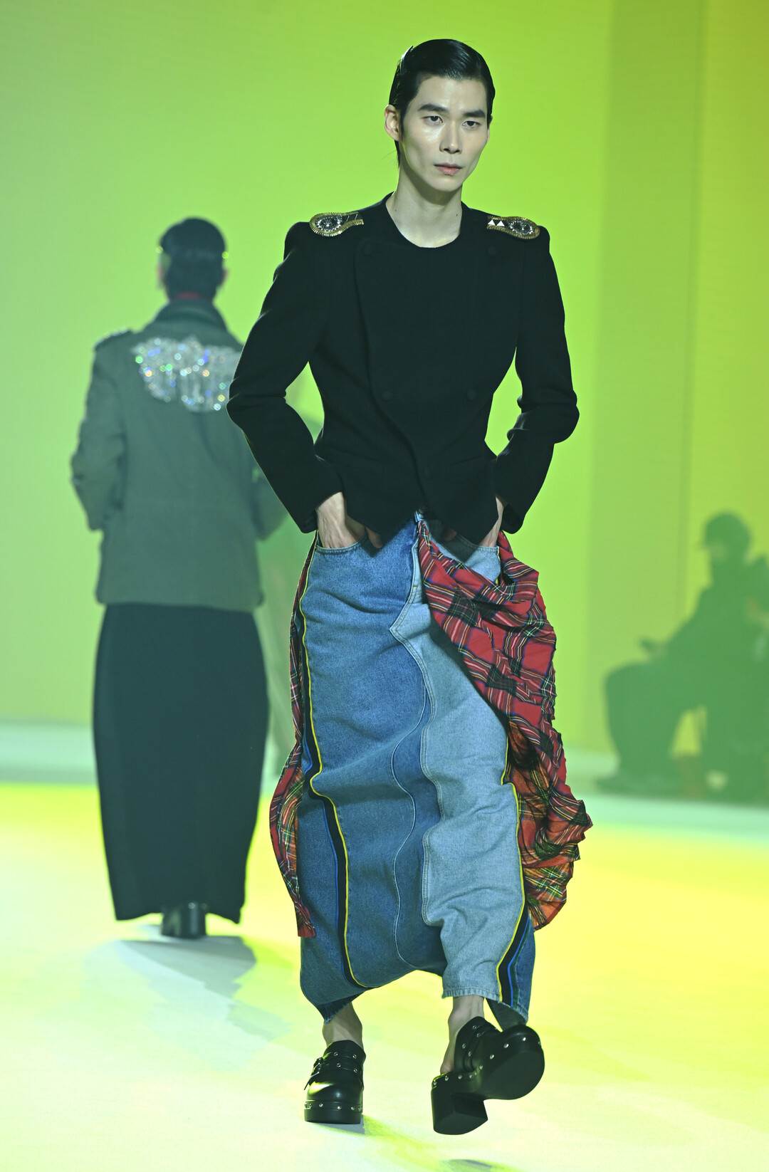 데님 소재를 활용한 레이어링과 레드 타탄 체크의 대담한 사용은 스트리트 감성과 클래식 테일러링의 만남을 보여줬다. 블랙 재킷에 크리스탈 엠벨리시먼트를 더하고, 데님과 레드 체크 패브릭을 비대칭으로 조합한 팬츠는 펑크 정신과 하이패션을 결합한 혁신적 시도였다.