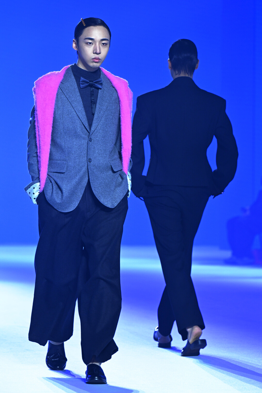 핑크 퍼 숄더 피스가 얹혀진 그레이 재킷은 클래식과 아방가르드의 충돌을 상징적으로 보여줬다. 정통 테일러링의 그레이 재킷 위에 과감한 핑크 컬러의 풍성한 퍼 장식을 더한 이 룩은 전통적 남성복의 경계를 허물며 젠더리스 패션의 가능성을 제시했다. 블랙 보타이와 폴카닷 커프스 디테일은 빈티지 감성을 더하며 70년대 댄디즘을 재해석했다.
