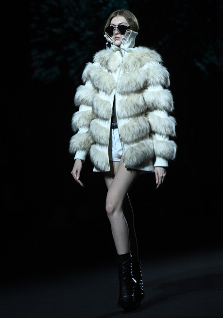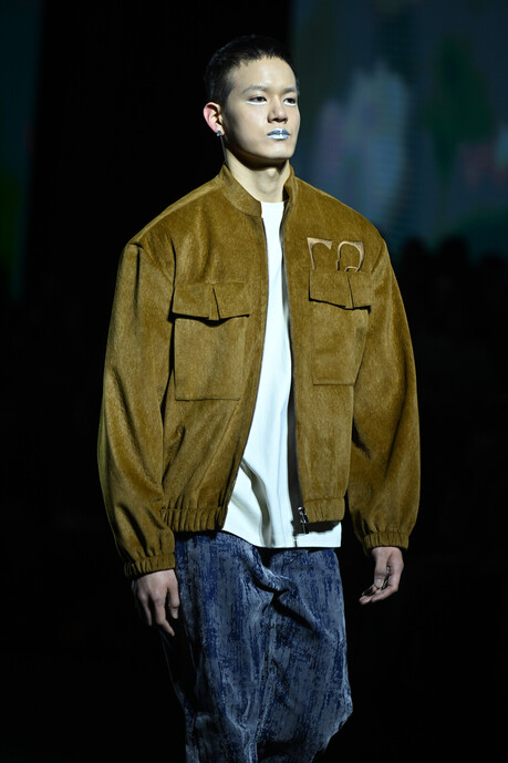 컬렉션 전반에 걸쳐 블랙과 화이트의 극명한 대비가 핵심 모티프로 등장했다. 오버사이즈 블랙 레더 라이더 재킷과 퍼 디테일 쇼츠, 화이트 후디 코트와 퍼지 텍스처 팬츠의 토탈 룩은 상반된 에너지의 공존을 표현했다. 특히 화이트 컬렉션은 순수함과 재탄생을 상징하며, 새틴 후드가 달린 퍼 코트는 마치 번데기의 보호막처럼 착용자를 감싸는 형태로 디자인됐다.