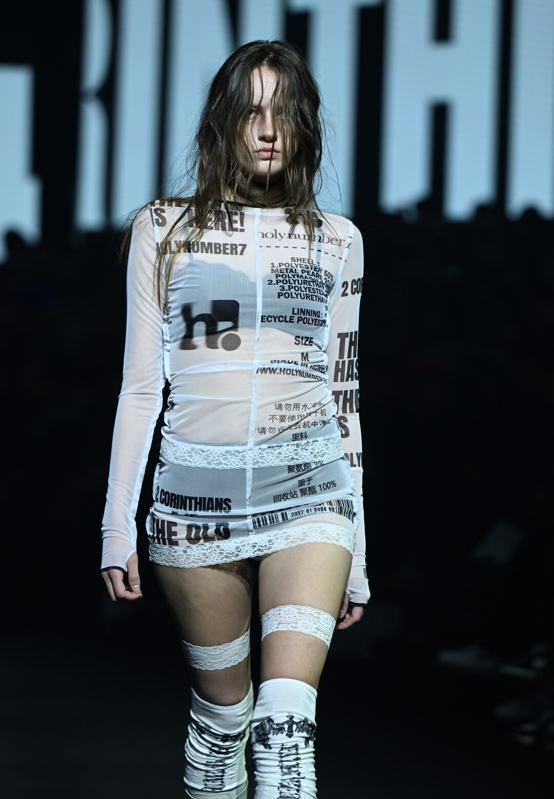 홀리넘버세븐 컬렉션에서 주목할 만한 또 다른 요소는 텍스트와 그래픽의 적극적 활용이다. 화이트 시어 롱슬리브 톱에 프린트된 'HOLYNUMBER7', '1 CORINTHIANS', 중국어와 영어가 혼재된 텍스트는 글로벌 시대의 혼종성과 정보의 파편화를 상징한다. 이는 단순한 장식적 요소를 넘어, 현대 사회의 복잡성과 다층적 정체성에 대한 메타포로 기능한다.