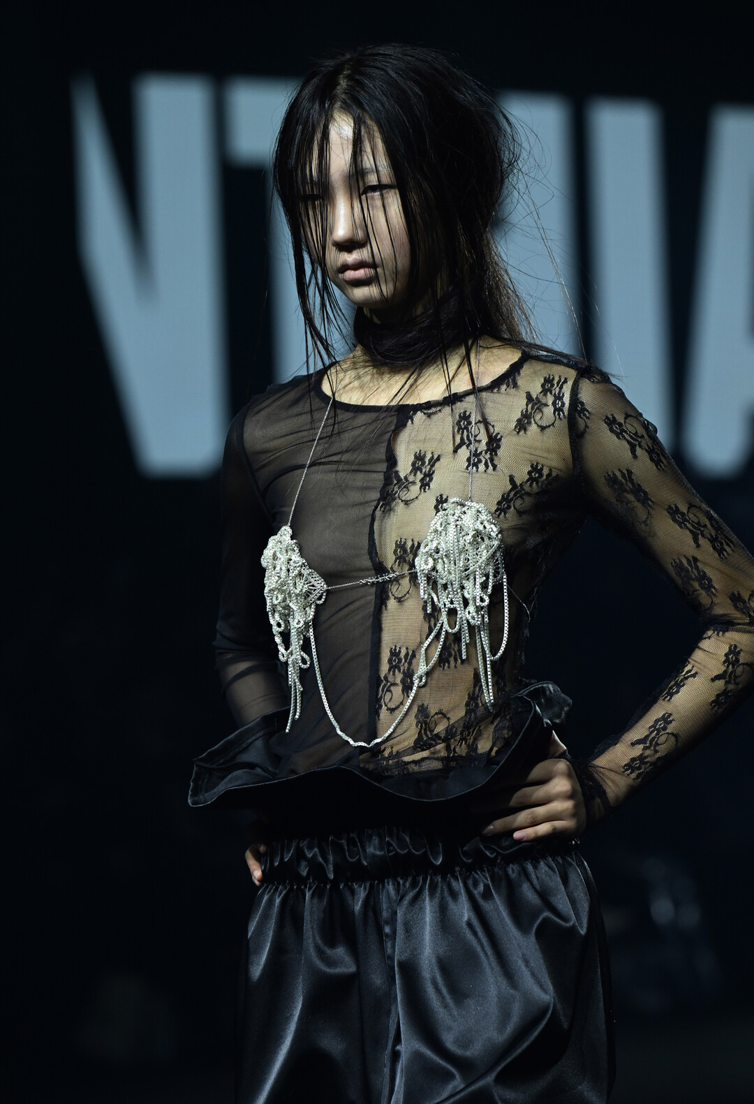 런웨이를 장식한 룩은 이러한 철학을 압축적으로 보여줬다. 올리브 그린 톤의 시어 메시 톱 위에 은빛 크리스털 조류 장식이 체인으로 연결된 네크피스는 파편화된 아름다움이 재조합되어 새로운 생명을 얻는 과정을 상징했다. 블랙 새틴 팬츠와의 조합은 어둠 속에서 빛을 발견하는 변태의 순간을 시각화했다.