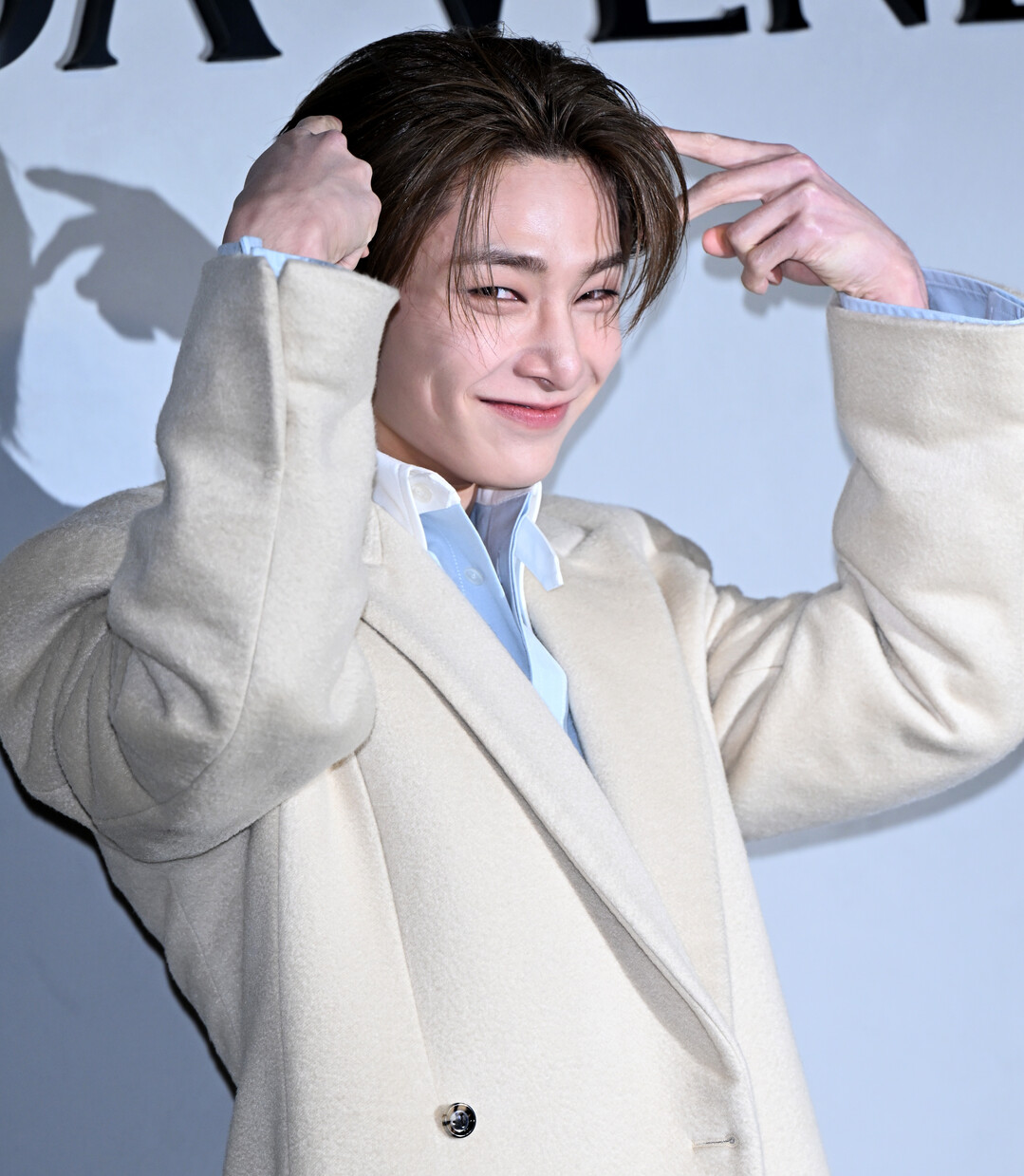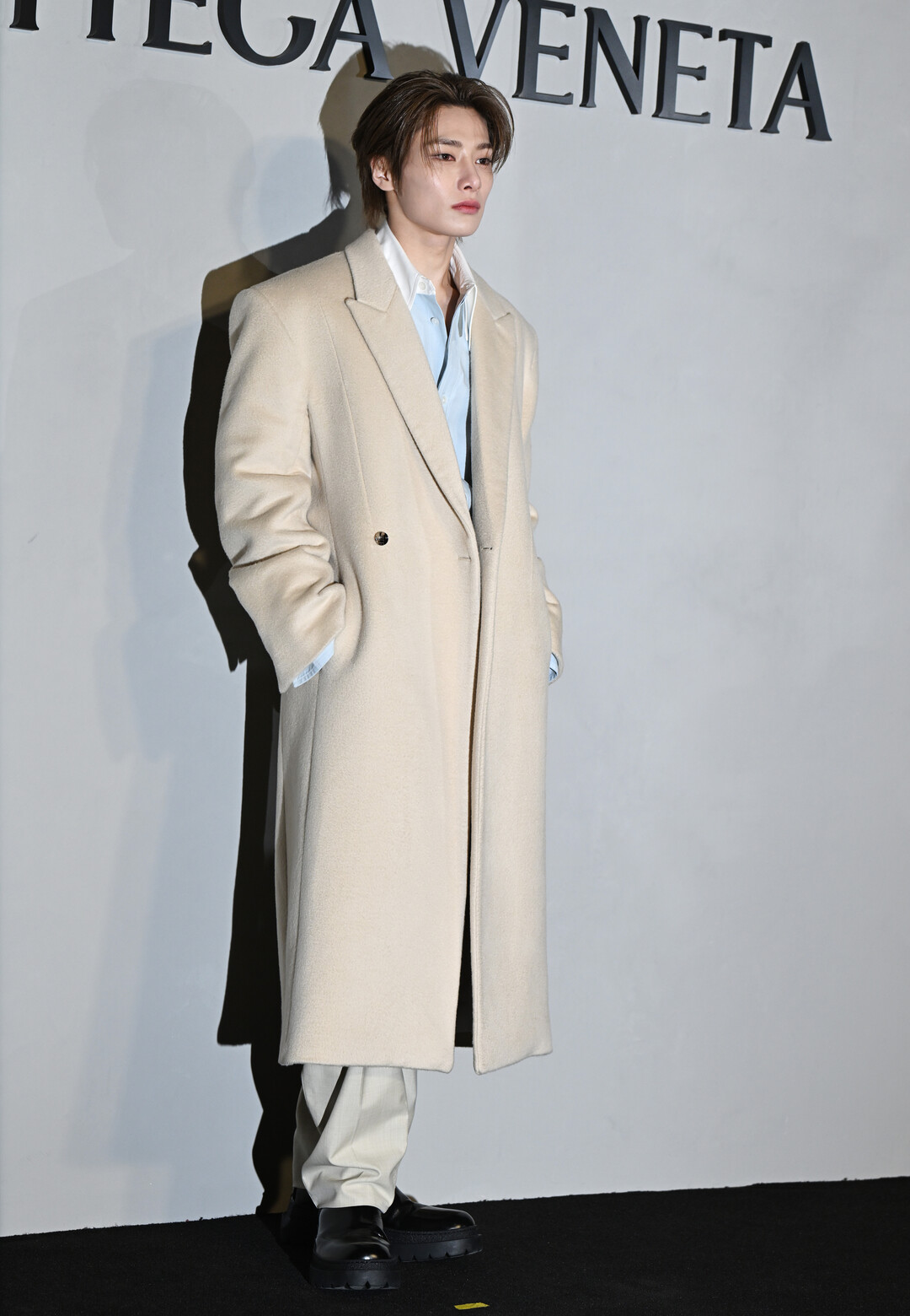 이날 아이엔은 크림 베이지 컬러의 오버사이즈 더블 브레스트 코트에 스카이 블루 셔츠를 매치한 깔끔한 스타일링을 완성했다. 넉넉한 실루엣의 롱 코트는 부드러운 울 소재로 제작되어 고급스러운 질감을 자랑했으며, 더블 브레스트 디자인과 와이드 라펠이 클래식한 우아함을 더했다.