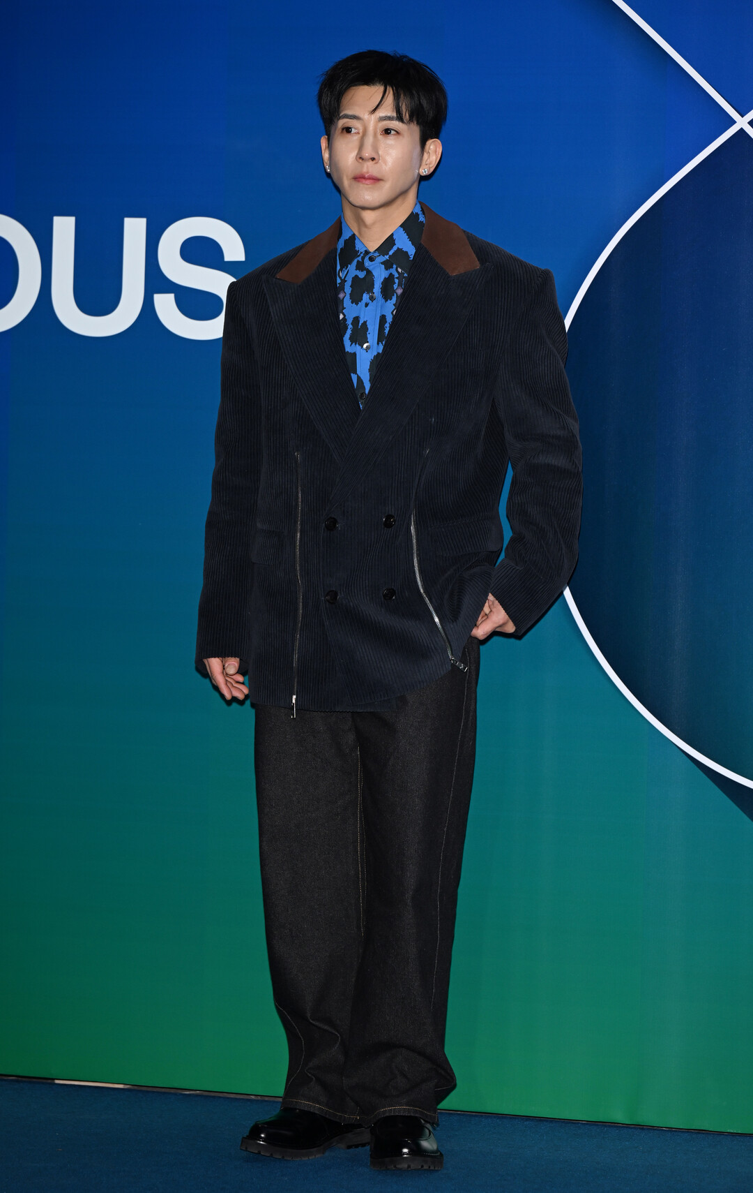재킷 안에 레이어링한 셔츠는 코발트 블루 베이스에 블랙 애니멀 프린트가 전체적으로 배치된 디자인이다. 레오파드를 추상적으로 재해석한 듯한 패턴은 블랙 재킷 사이로 드러나며 강렬한 시각적 포인트를 제공했다.