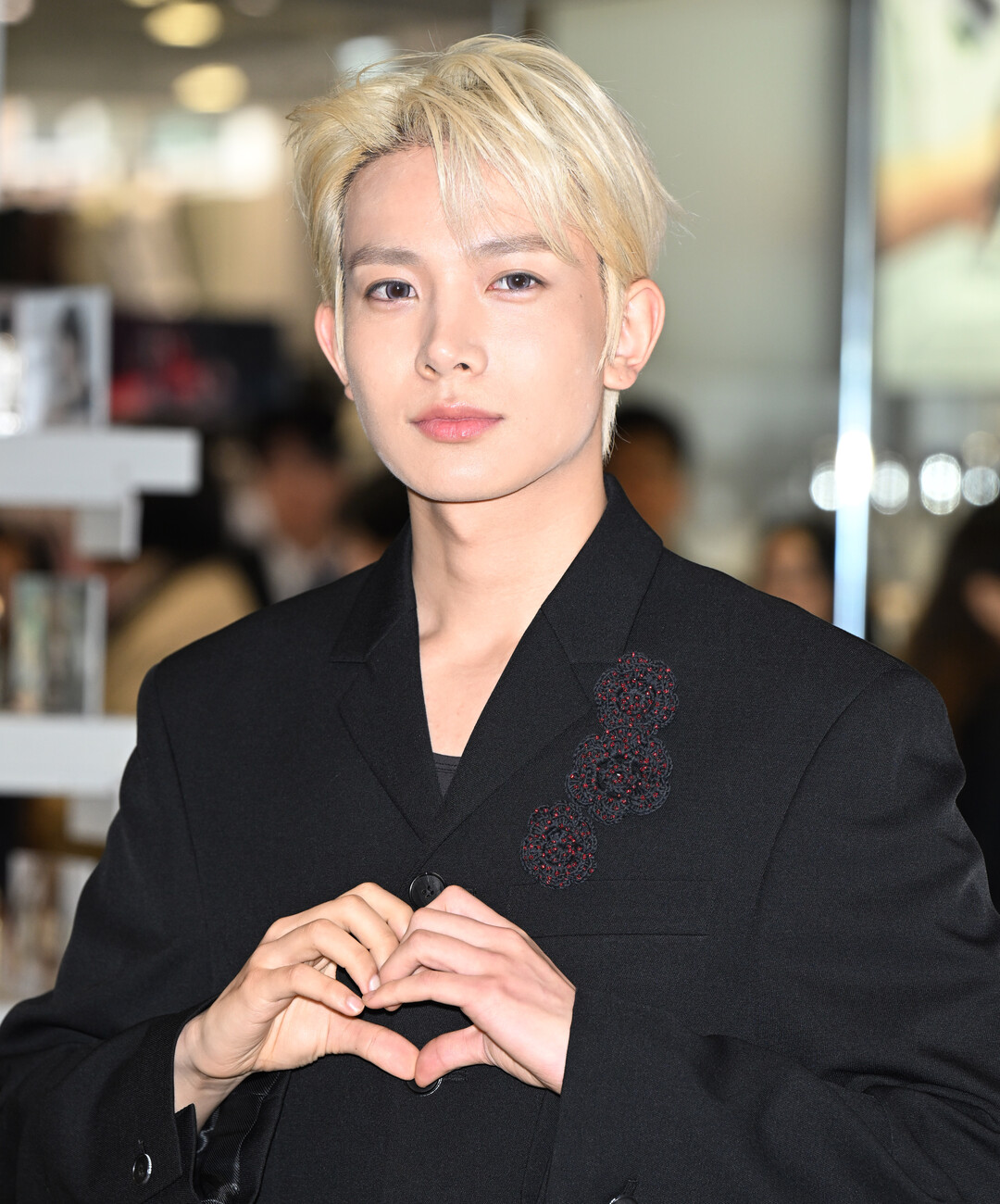 22일 서울 성수동 무신사 메가스토어에서 열린 컬러렌즈 브랜드 클라셋(Classet) 매장 오픈 행사에 참석한 그는 플래티넘 블론드 헤어와 레드 크리스털 비즈 플로럴 장식이 가미된 올블랙 수트 차림으로 등장, 압도적인 비주얼로 현장을 장악했다.