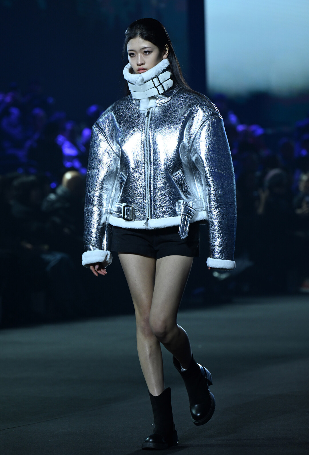 실버 메탈릭 가죽 크롭 재킷은 화이트 퍼 라이닝과 벨트 디테일로 럭셔리한 미래 감성을 표현했다. 광택 나는 메탈릭 소재는 겨울 시즌의 실용성을 유지하면서도 아방가르드한 감각을 더해 컬렉션의 예술적 완성도를 높였다. 화이트 패딩 칼라 디테일은 기능성과 디자인을 동시에 강조하며 스트리트 럭셔리의 새로운 방향을 제시했다.