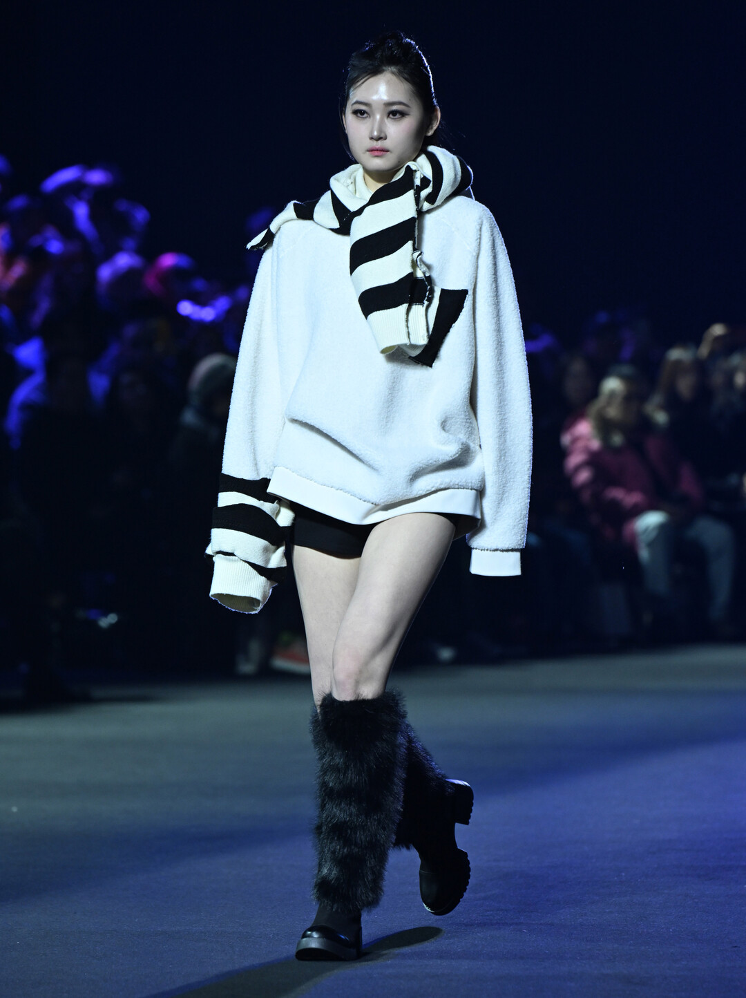 화이트 양털 재킷과 블랙 쇼츠의 조합은 스키 리조트 패션을 연상시키면서도 도시적 감성을 더해 실용성과 패션성을 모두 충족시켰다. 블랙과 화이트 스트라이프 패턴의 니트웨어는 모노톤 컬러로 통일하면서도 패턴을 통해 시각적 리듬감을 더했다.
