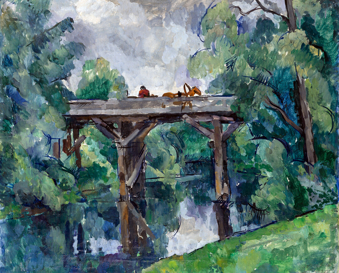 화면은 무성한 녹색 수목으로 둘러싸인 목조 다리 구조물을 중심으로 구성되어 있다. 다리 위에는 붉은 옷을 입은 인물과 갈색 말이 배치되어 있어, 러시아 시골 풍경의 일상적 순간을 포착하고 있다. 콘찰로프스키 특유의 대담한 붓놀림과 풍부한 색채 레이어링이 두드러지며, 청록색, 올리브색, 에메랄드 톤의 다층적 녹색 처리는 세잔의 구조적 색면 분할 기법을 연상시킨다.