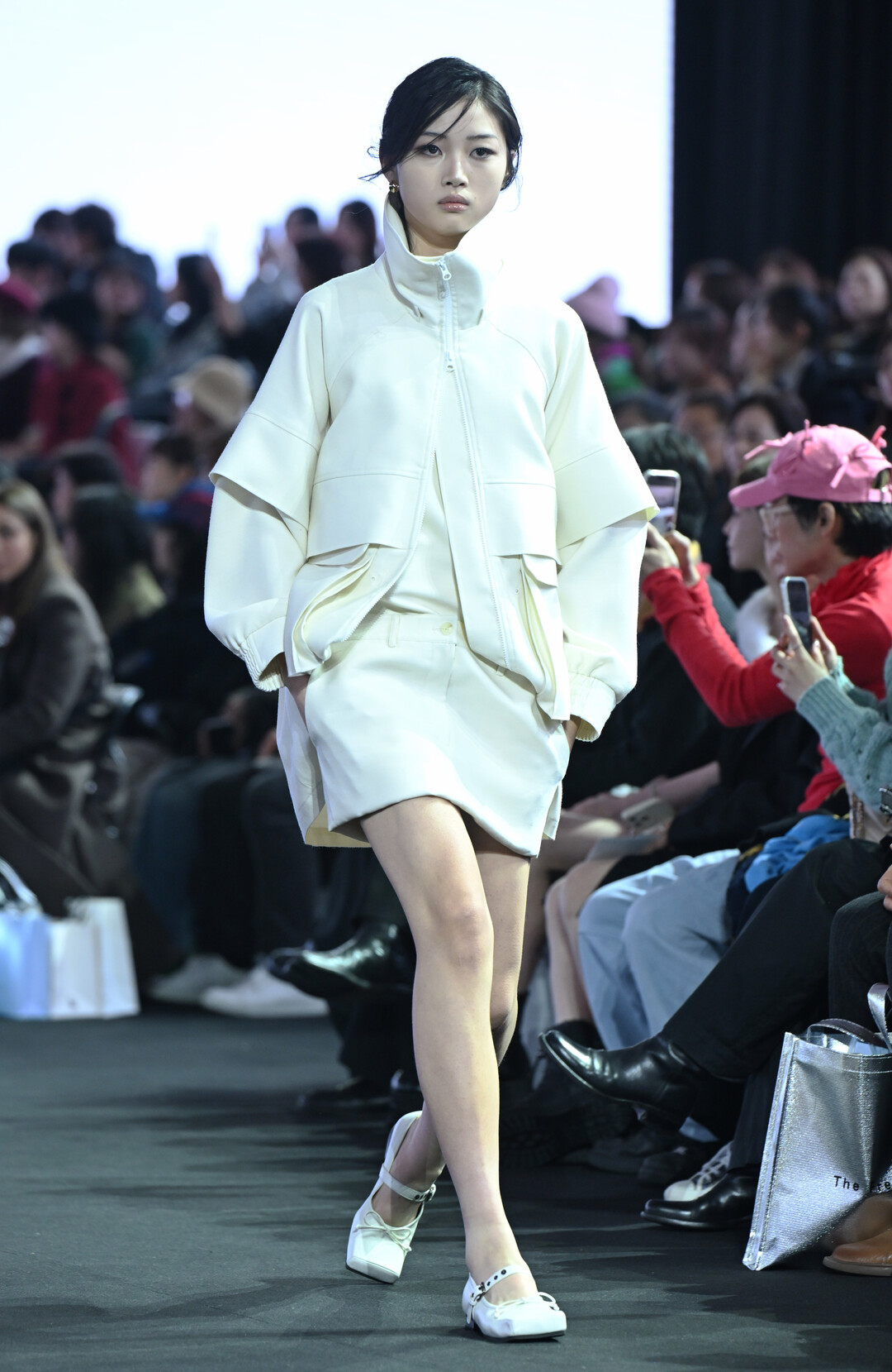 화이트 컬렉션은 순수함과 재탄생의 메시지를 담았다. 오버사이즈 화이트 봄버 재킷과 미니스커트의 조합은 스포티한 감성과 럭셔리의 경계를 넘나들었다. 특히 볼륨감 있는 소매와 케이프 디테일은 움직임에 따라 변화하는 실루엣의 역동성을 강조했다.