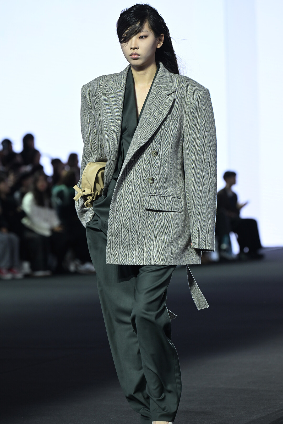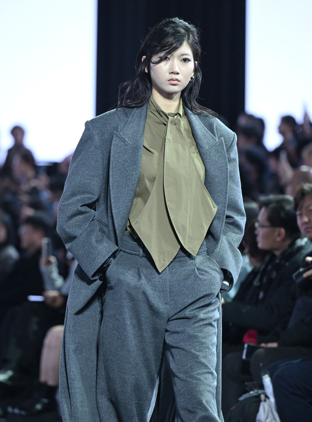 'Layered Raise-Up'의 핵심 개념인 레이어링은 컬렉션 전반에 걸쳐 다양한 방식으로 표현됐다. 블랙 글로시 레더 재킷 위에 레이어드된 화이트 셔츠 헴, 그레이 헤링본 더블 브레스티드 블레이저와 올리브 그린 드레이프 톱의 조합, 그레이 코트 안에 겹쳐진 올리브 넥타이 블라우스는 각각 다른 텍스처와 컬러의 레이어가 만들어내는 시각적 깊이를 탐구했다.