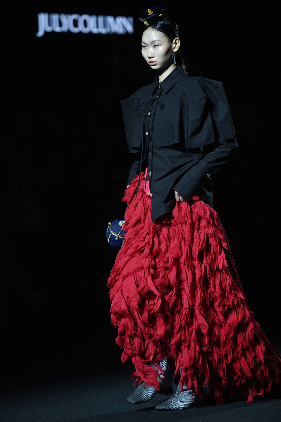 블랙 케이프와 레드 프린지 스커트의 조합은 컬렉션의 클라이맥스를 장식했다. 케이프의 구조적 실루엣은 전통 두루마기의 위엄을, 레드 프린지 스커트는 전통 무용 의상의 역동성을 담았다. 특히 프린지 디테일은 움직임에 따라 흔들리며 빛의 흔적을 시각적으로 구현했다.