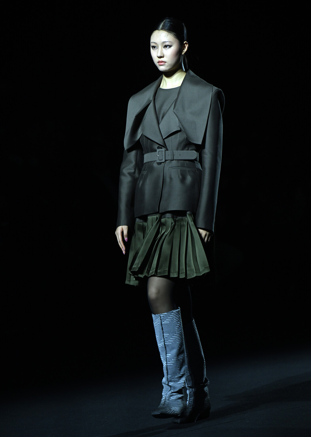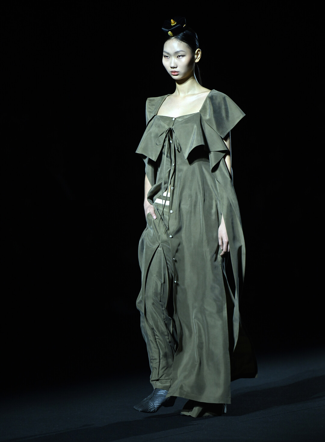 런웨이에 등장한 룩들은 박소영 디자이너의 한국 전통에 대한 깊은 이해와 현대적 감각이 조화롭게 결합된 모습을 보여줬다. 첫 번째 룩의 차콜 그레이 재킷과 올리브 그린 플리츠 스커트 조합은 한복의 저고리와 치마 구조를 현대적 테일러링으로 재해석했다. 케이프 형태의 오버레이어는 전통 두루마기의 실루엣을 연상시키며, 플리츠 스커트의 주름은 한복 치마의 주름을 모던하게 표현했다.
