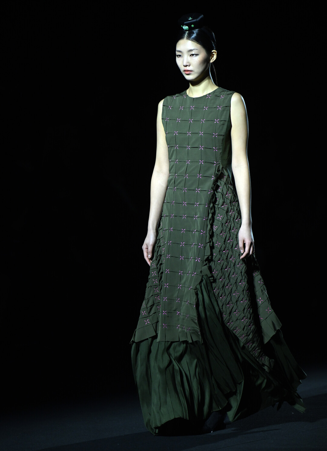 올리브 그린 드레이프 원피스는 한복의 유연한 실루엣을 극대화한 디자인이다. 비대칭적으로 흐르는 천의 흐름은 자연스러운 주름을 만들며, 중앙의 끈 디테일은 한복 고름을 연상시킨다. 화이트 플리츠 재킷과 스커트 세트는 한지의 백색 미학을 구현했으며, 플리츠 가공은 한지를 접었다 펼 때 생기는 주름선을 패턴화한 것이다.