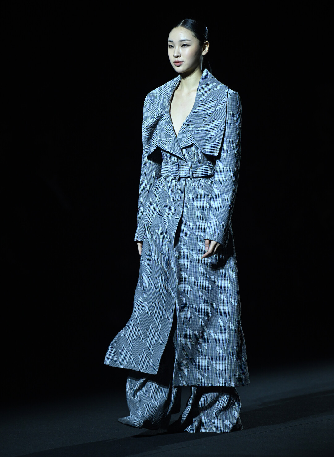 그레이 톤 체크 슈트는 한지의 질감에서 영감을 받았다. 섬세한 체크 패턴은 한지 표면의 미세한 섬유 결을 추상화한 것이며, 오버사이즈 핏과 벨트 디테일은 전통 포목의 여유로운 드레이프를 현대적으로 풀어냈다.