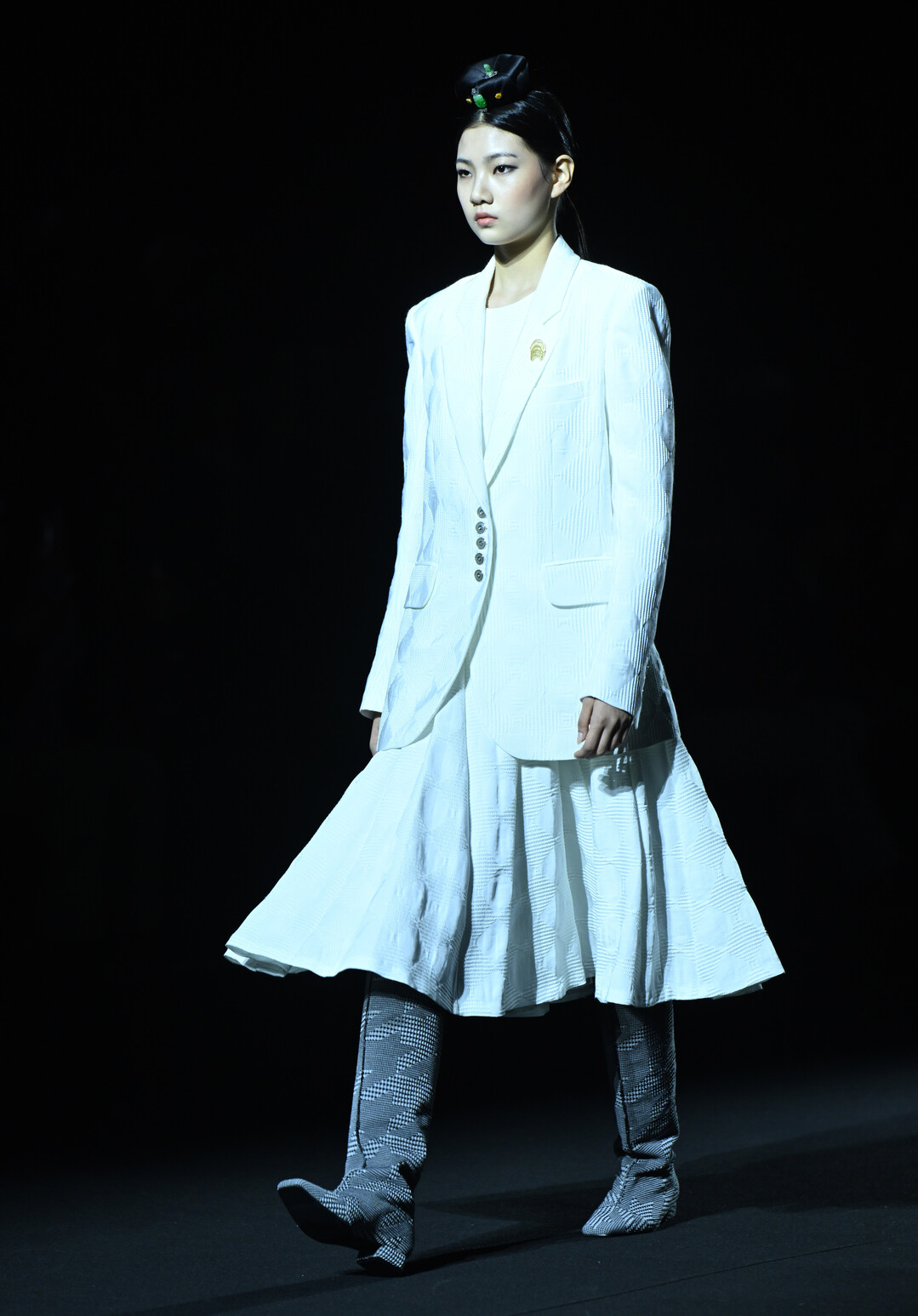 박소영 디자이너의 진가는 소재 선택과 디테일 처리에서 드러난다. 체크 패턴 직물은 전통 창호지의 격자 문양을 현대적으로 변형했으며, 메탈릭 부츠는 기와의 광택을 현대적 소재로 표현했다. 특히 반복적으로 등장하는 체크 패턴 부츠는 전통 기와 지붕의 규칙적 배열을 신발 디자인으로 옮겨온 것이다.