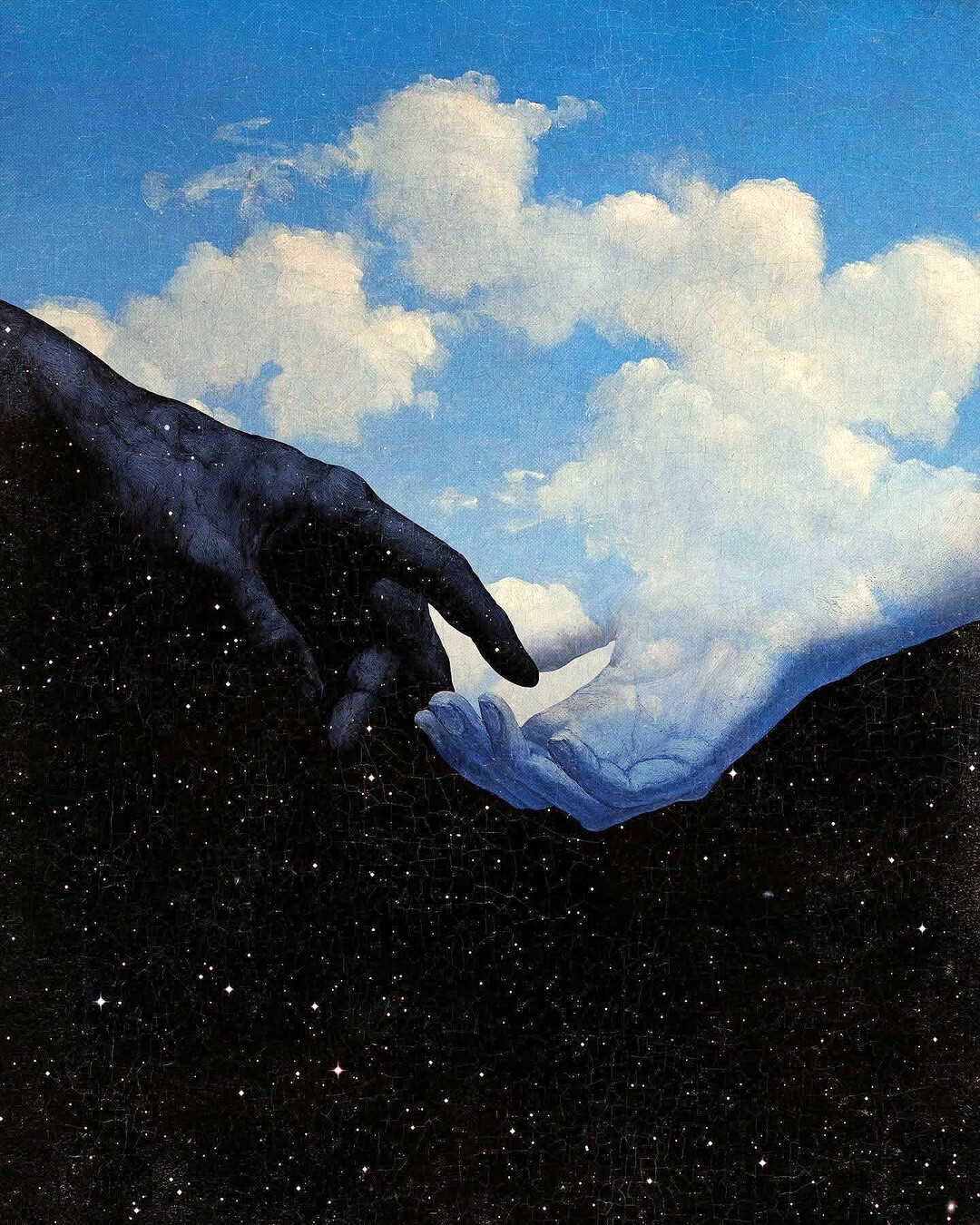 왼쪽 상단에서 내려오는 손은 우주의 어둠으로 물들어 있다. 검고 깊은 피부 위로 별들이 촘촘히 박혀 있어, 이 손이 우주 그 자체임을 암시한다. 오른쪽 하단에서 올라오는 손은 반대로 하늘의 물질로 이루어진 듯, 창백한 파란빛과 구름의 결이 손가락 마디마디에 스며 있다. 두 손이 마주 향하는 구도는 미켈란젤로의 시스티나 성당 천장화 '아담의 창조'를 즉각적으로 연상시킨다. 그러나 멘데스는 신과 인간의 접촉이 아니라, 우주와 자연, 어둠과 빛, 밤과 낮이라는 우주적 이원성의 만남으로 그 도상을 재해석한다.