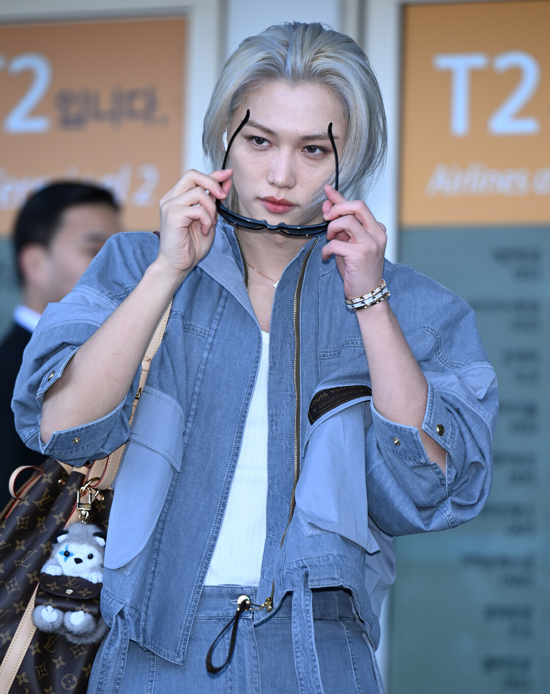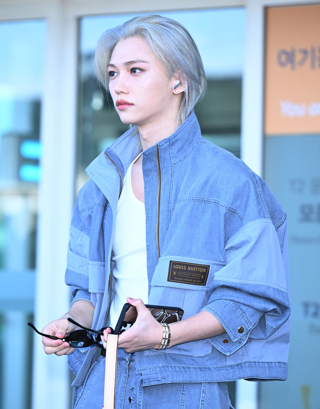 이날 필릭스가 선보인 패션은 루이 비통(Louis Vuitton) 아이템으로 풀세트를 구성한 코디네이션이었다. 루이 비통의 시그니처 패치가 가슴과 하의에 선명하게 부착된 블루 데님 워크웨어 재킷과 카고 팬츠를 매치해, 머리부터 발끝까지 하나의 브랜드로 통일된 일관성 있는 스타일을 완성했다.