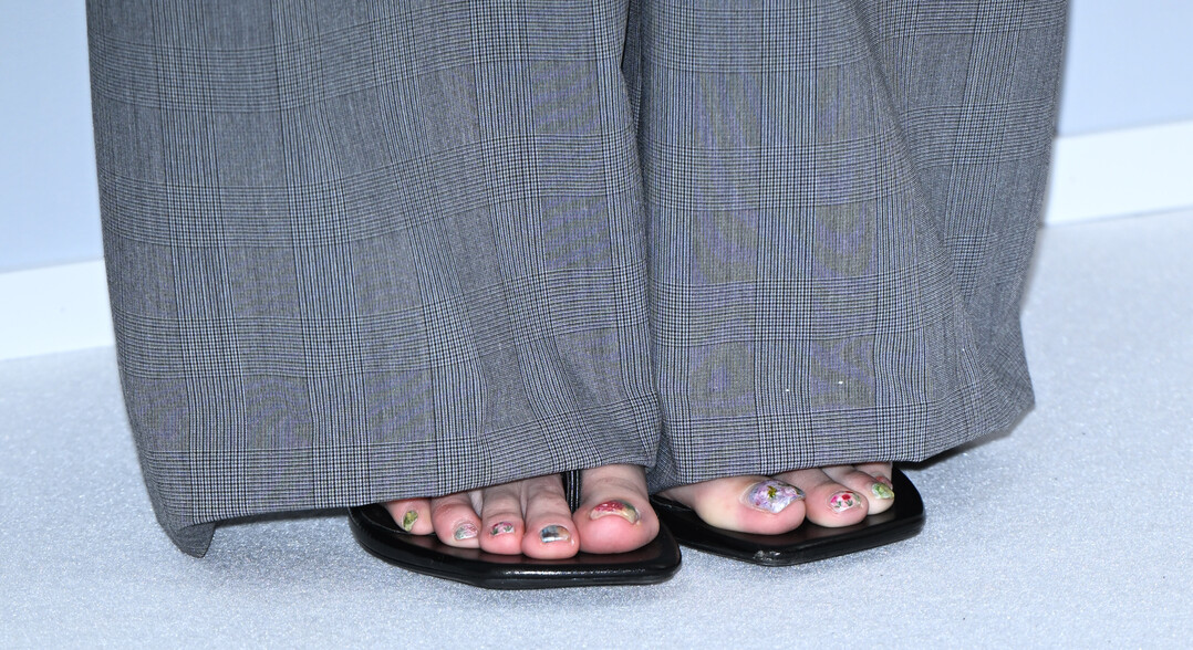 풋웨어는 블랙 스퀘어 토 스틸레토 힐 뮬로 마무리해 캐주얼한 레이어드 룩에 날카로운 엣지를 부여했다. 특히 이날의 숨은 하이라이트는 페디큐어였다. 발톱에는 플로럴 패턴의 플라워 네일아트가 각 발가락마다 섬세하게 장식되어 있어, 와이드팬츠 사이로 힐이 드러날 때마다 톡톡 튀는 개성미를 발산했다. 핑크, 그린, 퍼플 계열의 작은 꽃 모티프가 발끝에서 봄의 감각을 완성시켰다.