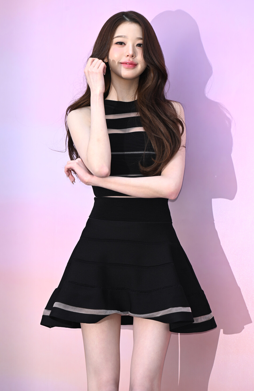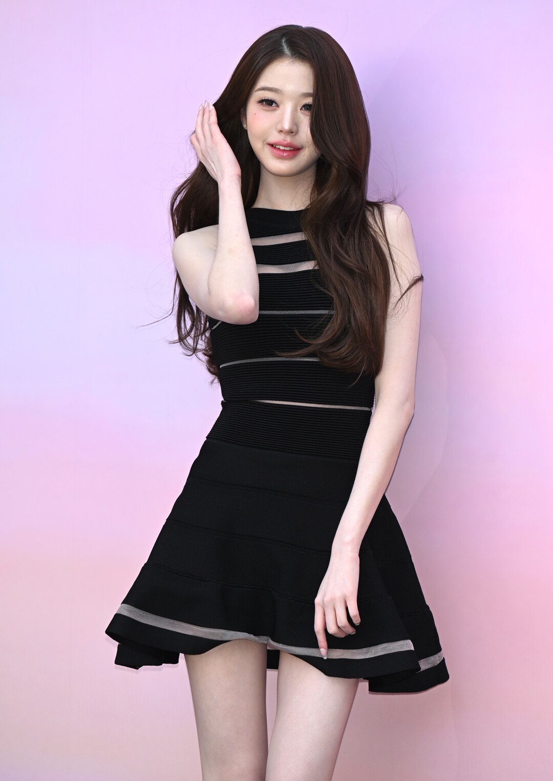 허리 부분은 얇은 시스루 밴드가 가로질러, 실루엣을 더욱 잘록하게 강조한다. 스커트는 풍성하게 퍼지는 플레어 실루엣으로 허리에서 엉덩이로 이어지는 곡선을 한층 돋보이게 했으며, 밑단에도 메시 소재의 트리밍이 장식되어 상하 대칭의 디자인 일관성을 완성했다. 밝고 화사한 파스텔 핑크와 라벤더가 그라데이션으로 번지는 포토월 배경과 블랙 원피스의 대비는 시각적으로 강렬한 인상을 남겼다.