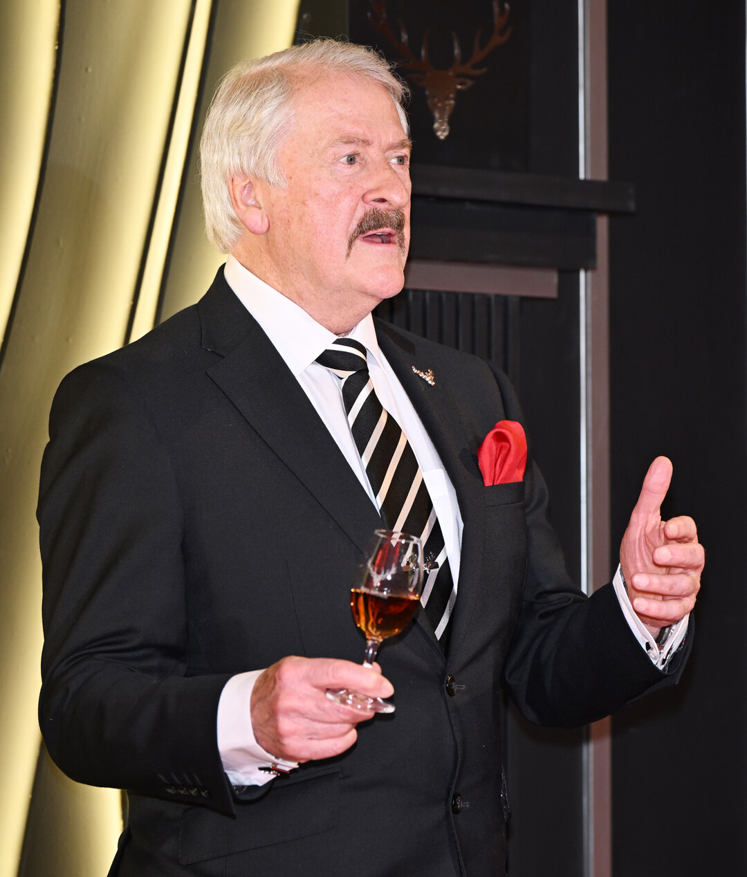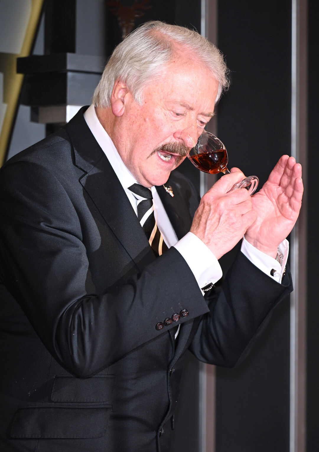 포토콜과 행사 내내 패터슨은 달모어 위스키가 담긴 글렌케언 잔을 손에 들고 특유의 화통한 표정과 제스처로 현장 분위기를 주도했다. 양손 엄지를 치켜세우는 유쾌한 포즈부터, 위스키 잔을 높이 들어 올리며 카메라를 향해 자신 있게 건배를 제안하는 모습까지, 반세기 넘게 무대를 누벼온 거장의 여유와 카리스마가 행사장 전체를 압도했다. 직접 달모어를 한 모금 음미하는 시음 장면에서는 수십 년간 단련된 전문가의 진지함이 고스란히 드러나 참석자들의 탄성을 자아냈다.