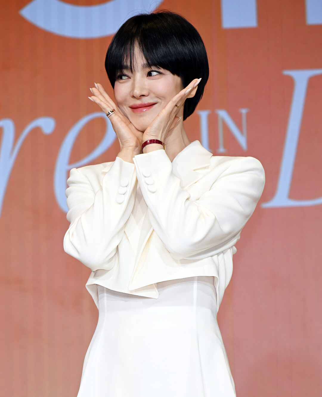 헤어 스타일은 단발 보브컷으로 깔끔하게 정돈해 세련미를 극대화했다. 미니멀한 메이크업과 절제된 액세서리 연출은 화이트 수트의 존재감을 부각시키며 '자연스러운 아름다움'이라는 브랜드 메시지와 완벽하게 조응했다. 송혜교 특유의 맑은 피부 톤은 화이트 컬러와 조화를 이루며 청순하면서도 고급스러운 분위기를 자아냈다.