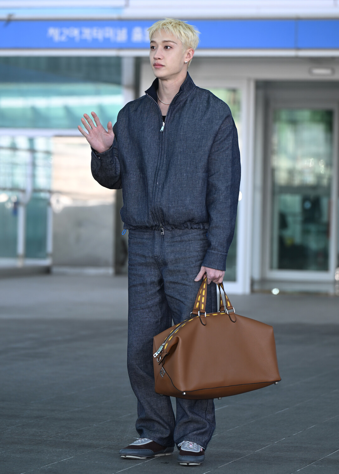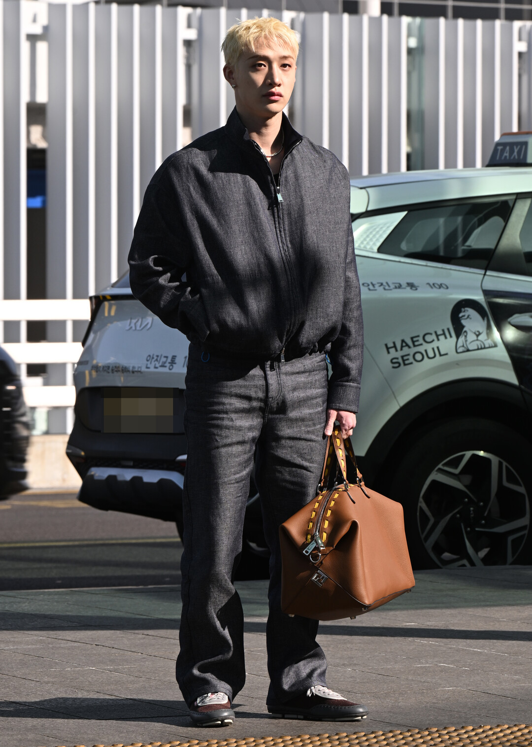 이번 스타일링의 핵심 아이템은 카멜 브라운 컬러의 펜디 대형 레더 토트백이었다. 차콜 다크 데님과의 극명한 컬러 대비가 시선을 즉각적으로 끌어당겼으며, 손잡이에 적용된 옐로우 스티칭 디테일이 럭셔리 하우스 특유의 장인정신을 은은하게 드러냈다. 대용량의 여행용 토트백을 한 손에 여유롭게 들고 선 모습에서 방찬 특유의 카리스마가 자연스럽게 배어났다.