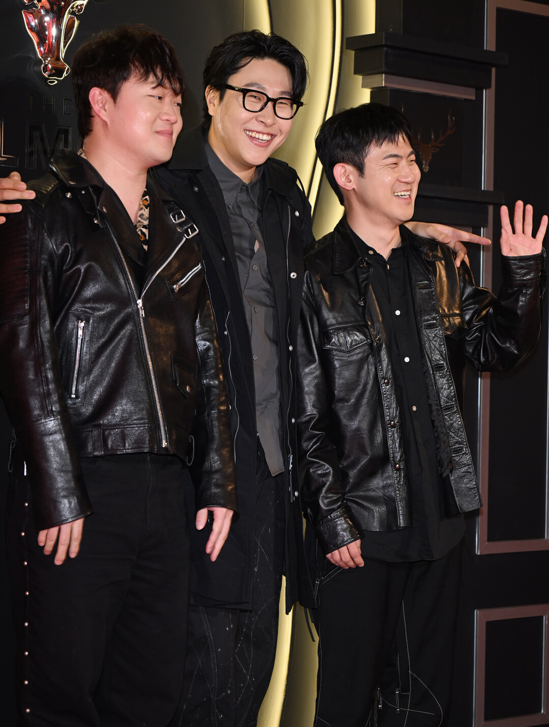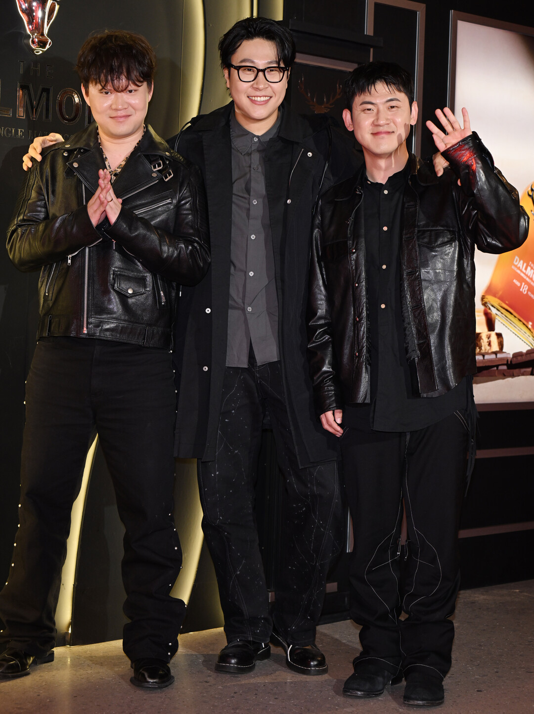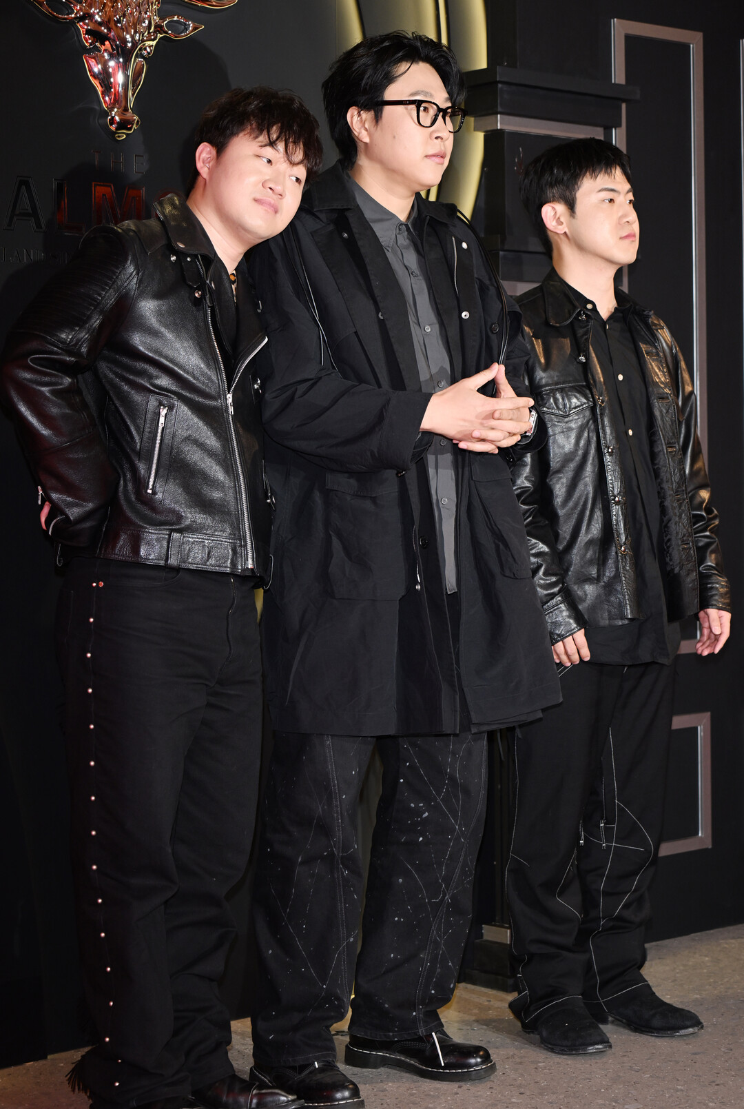 이날 세 멤버는 블랙 계열 레더 소재를 공통분모로 삼으면서도 각자의 개성이 뚜렷하게 살아있는 스타일링으로 눈길을 끌었다. 왼쪽의 정재형은 지퍼와 금속 버클 디테일이 돋보이는 클래식한 블랙 라이더 재킷에 블랙 팬츠를 매치해 로큰롤 감성의 시크한 무드를 연출했다. 안에는 레오파드 패턴 이너를 겹쳐 입어 묵직한 레더 룩 사이에서 개성 넘치는 포인트를 더했다.